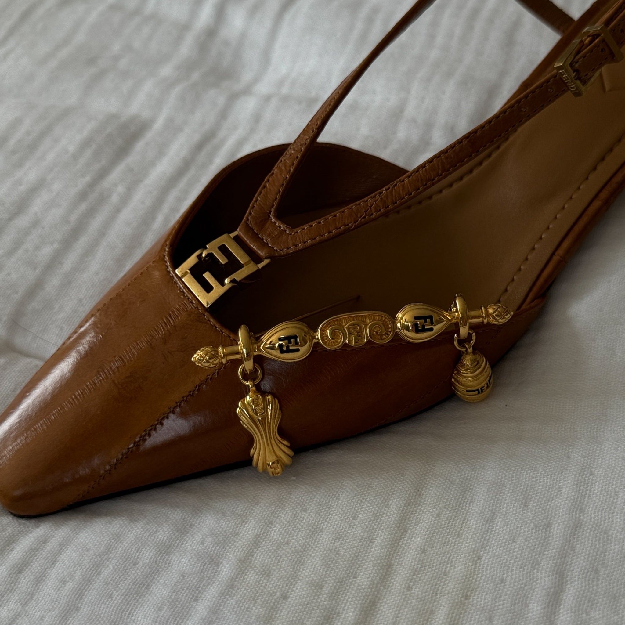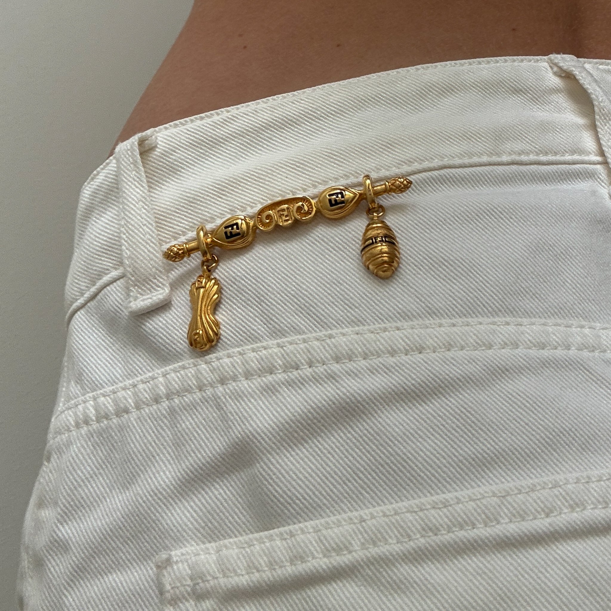 Versatile and timeless this rare fendi logo dangle charm vintage brooch is the epic accessory you've been looking for. Adorn your favorite blazer, scarf, or handbag—adding a touch of vintage luxury to any outfit. The details on this brooch are unmatched and so unique. This is a special addition to your trove.