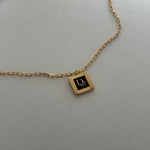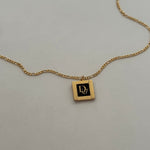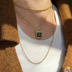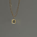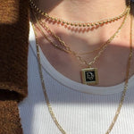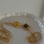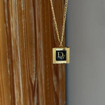 A classic gleaming vintage Deco Dior pendant crafted from authentic Christian Dior vintage cufflinks. A perfectly sized square pendant featuring black enamel showcasing the gold trim, ribbed detailing on the sides, and Dior script in the center. Pairs well with our best selling Dotty Lariat Necklace.