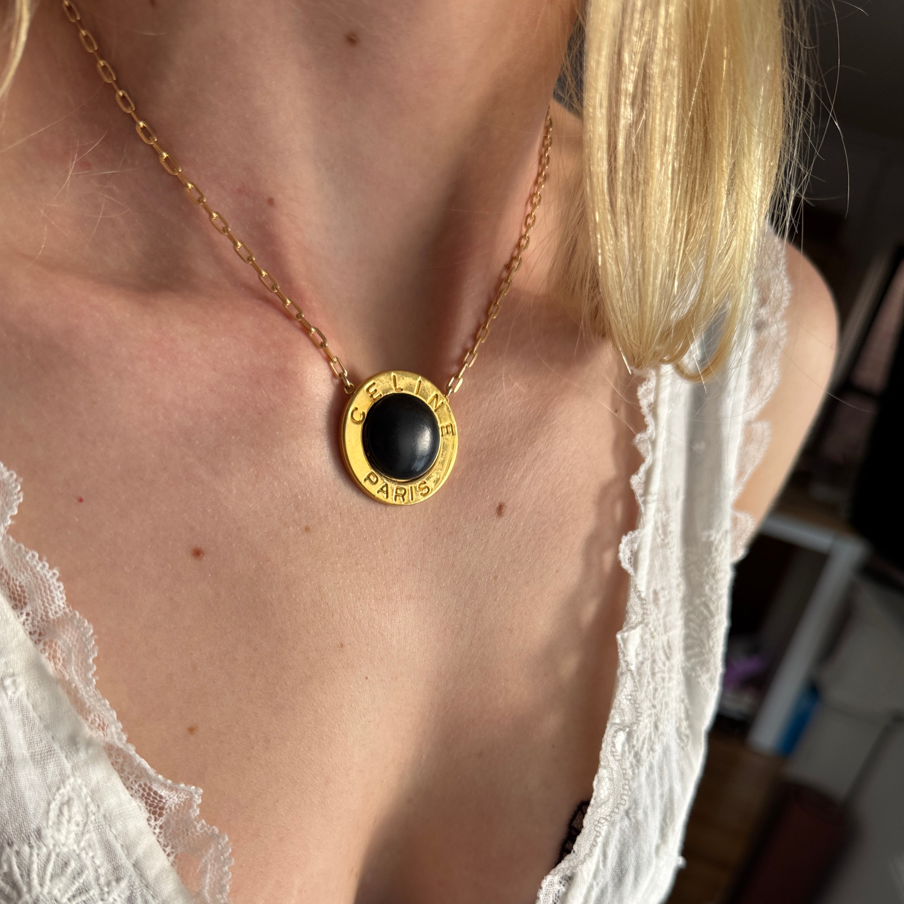 A little Parisian mystery, reimagined. This statement Celine piece was once a clip-on earring—now transformed into a sleek, wearable statement necklace. A rich onyx cabochon sits at the center of a gold medallion stamped with CELINE PARIS, creating a sharp contrast that feels both timeless and bold.