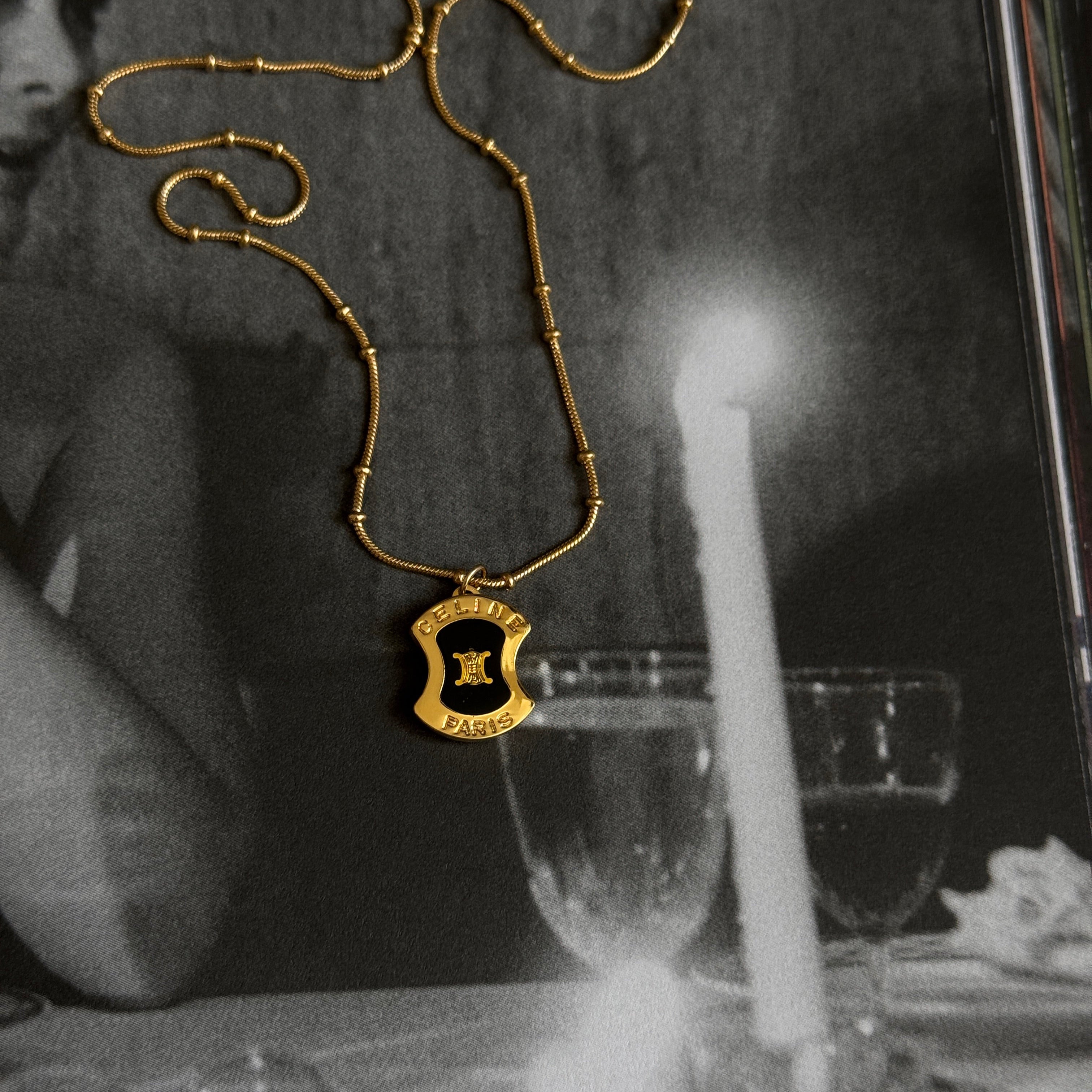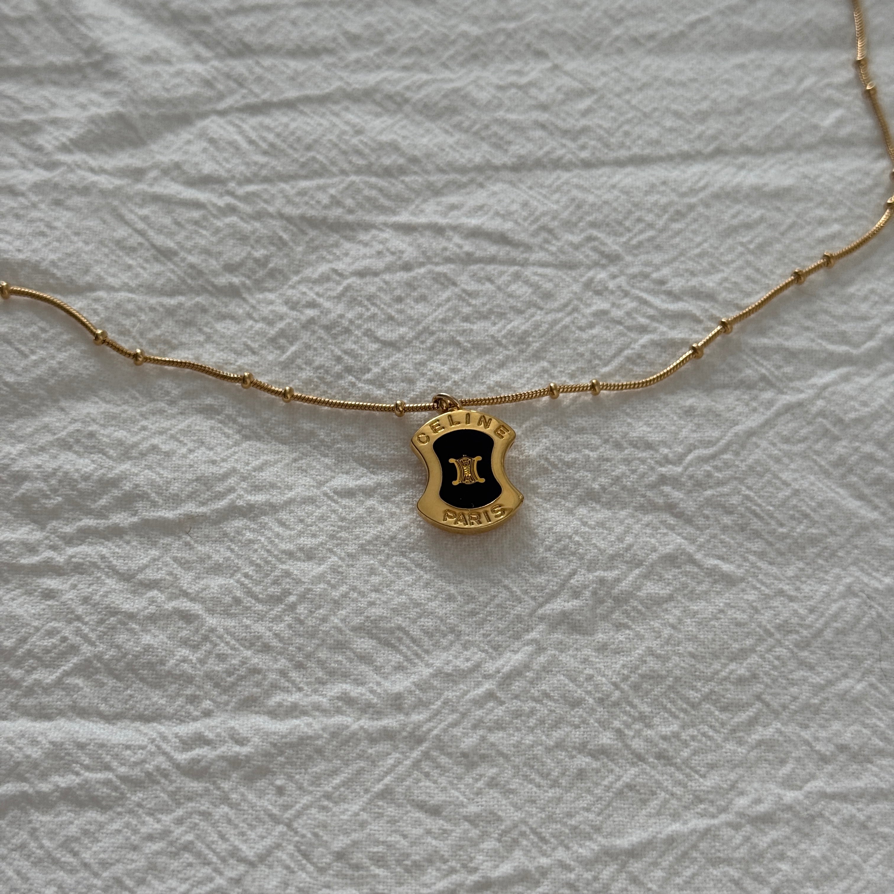 Originally a vintage cufflink, it’s been reimagined as a delicate pendant—featuring Celine’s signature black-and-gold crest, now suspended on a slinky, textured gold chain that catches the light in all the right ways.