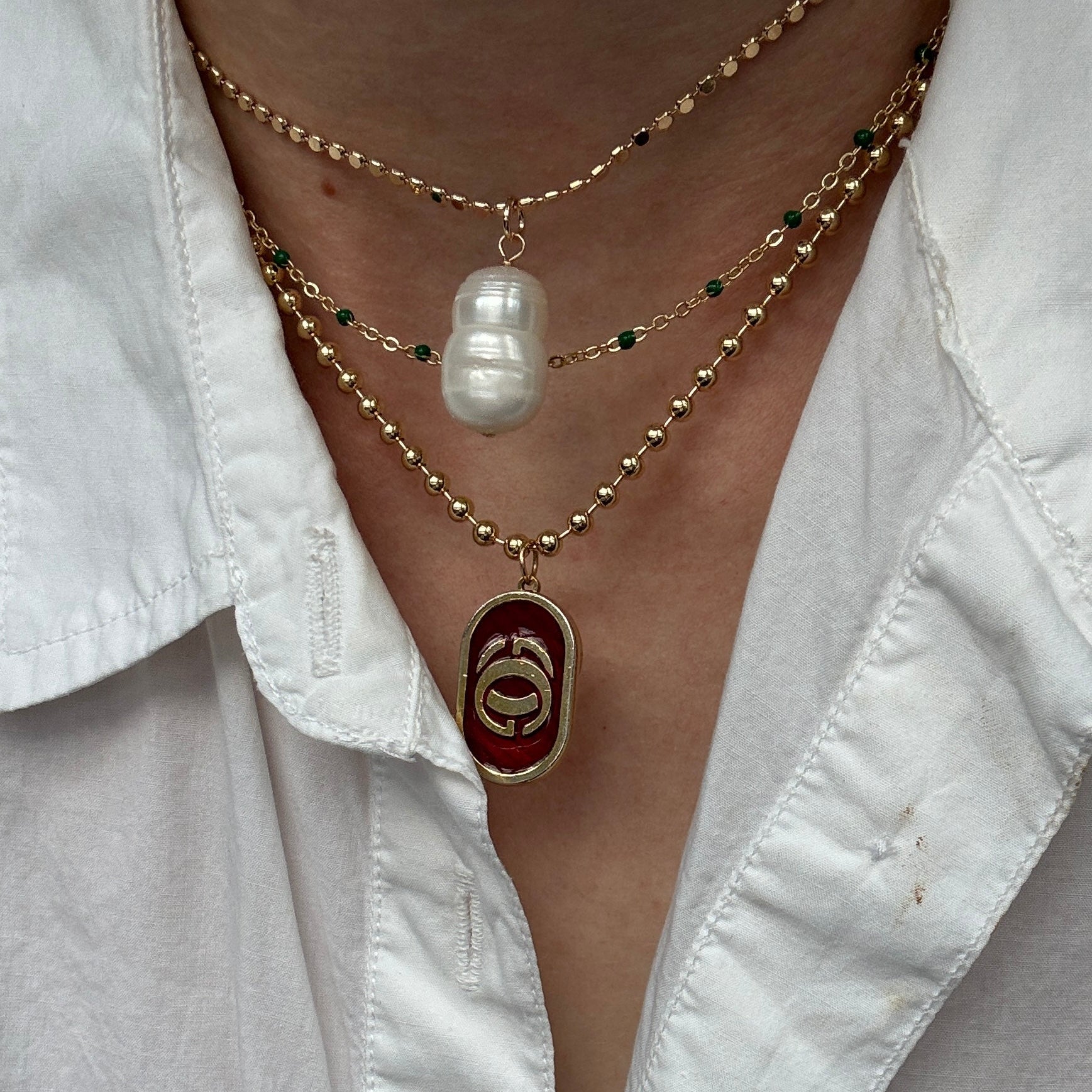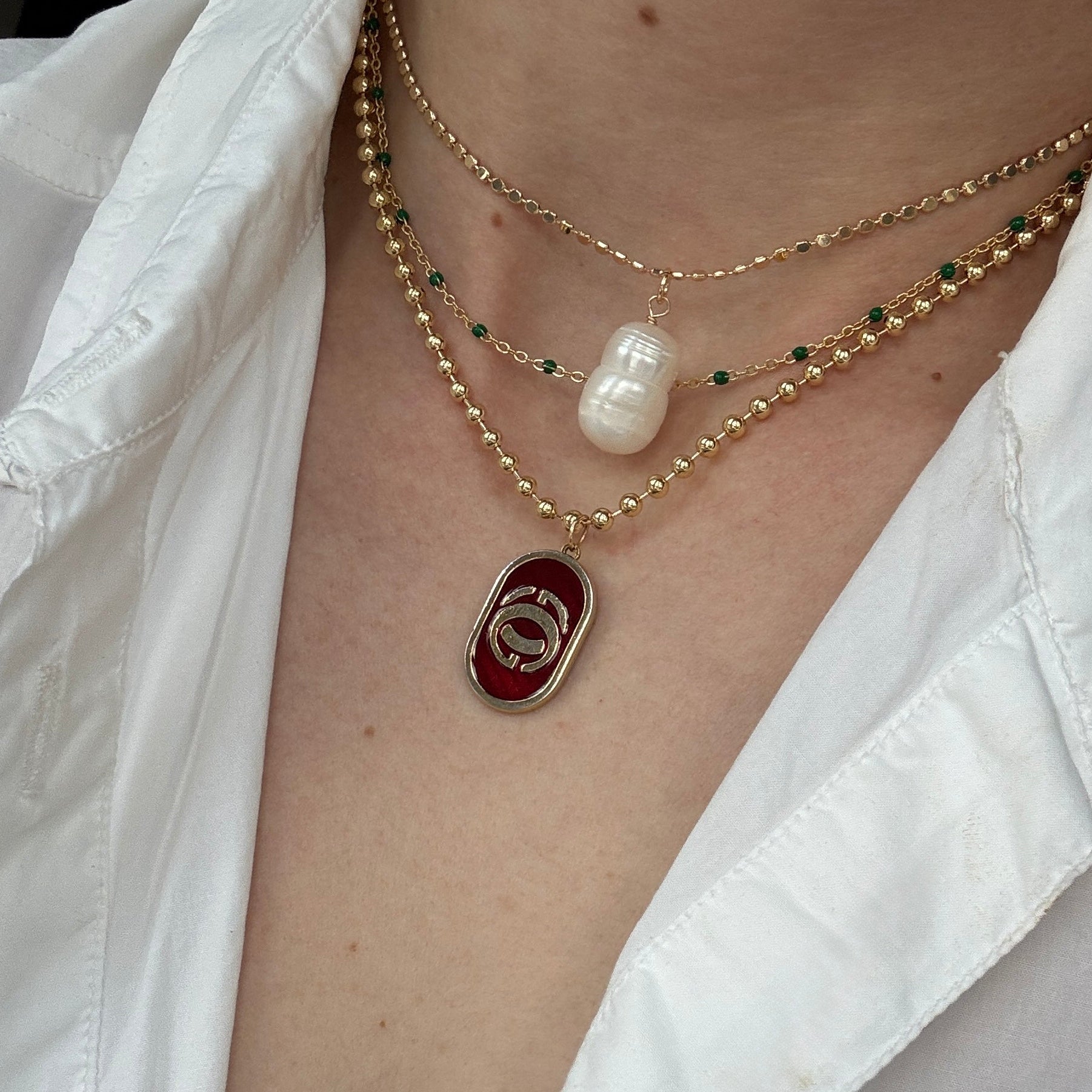 This authentic vintage Gucci pendant features a deep red enamel backdrop topped with the signature interlocking motif — framed in gold for dramatic contrast. It’s vibrant, luxurious, and full of personality… the kind of pop that turns heads.