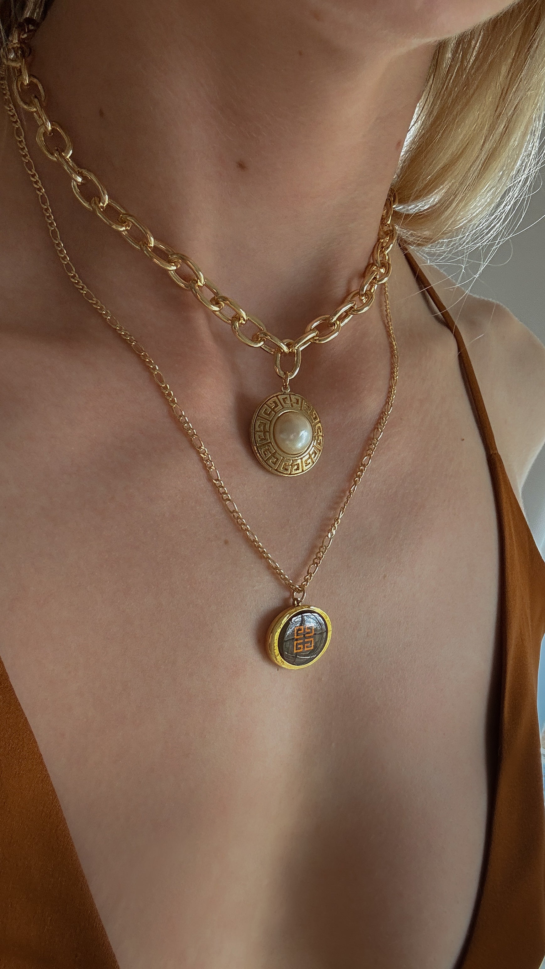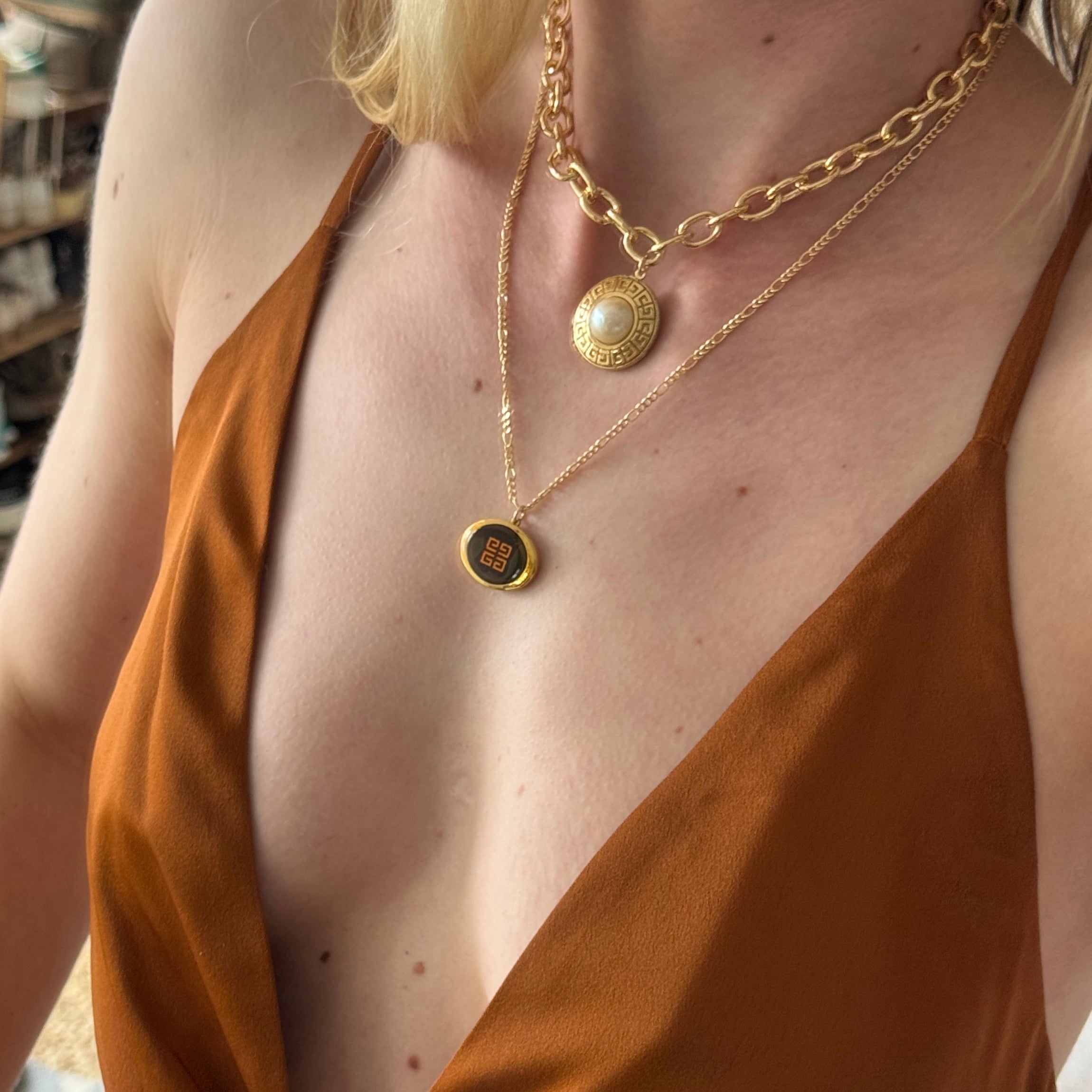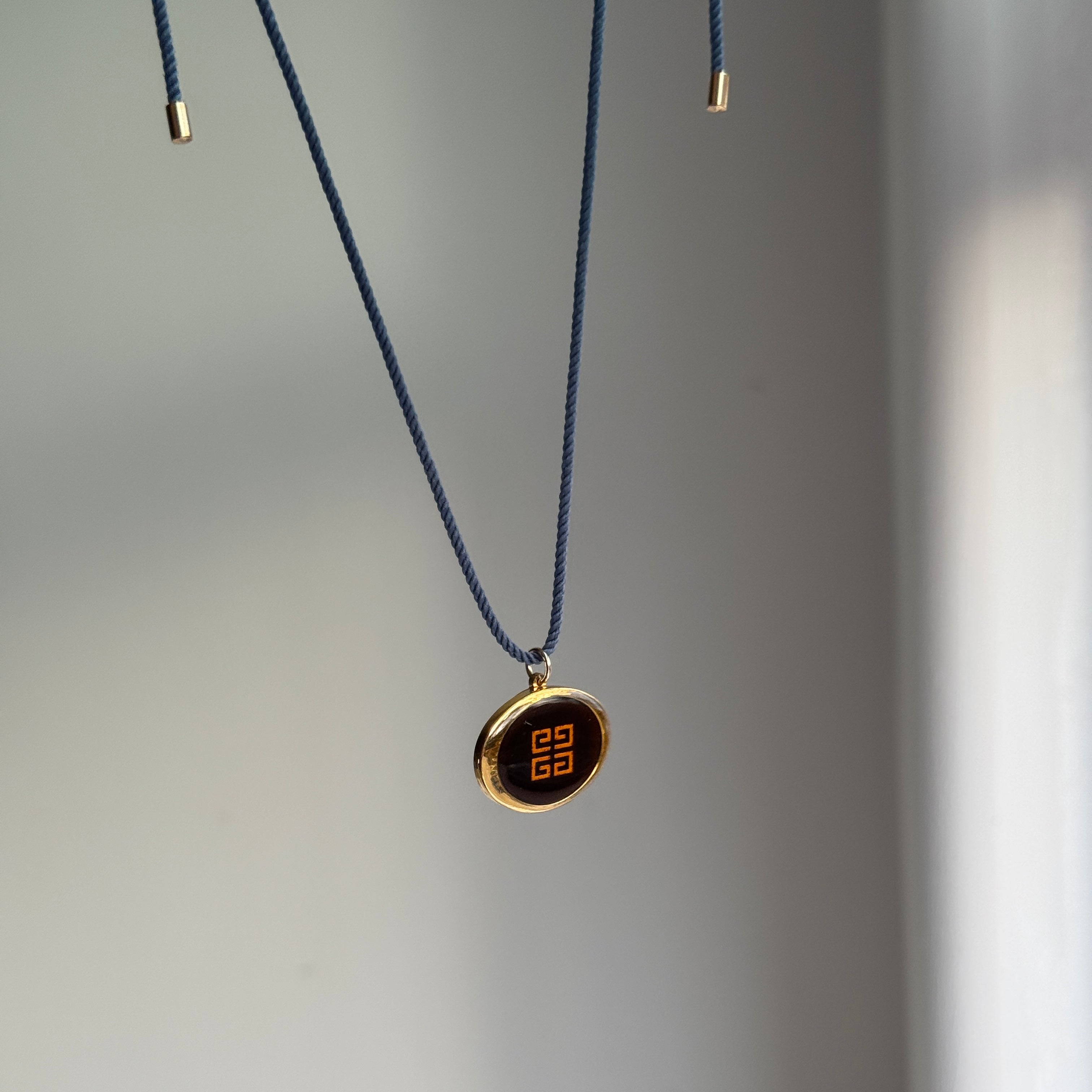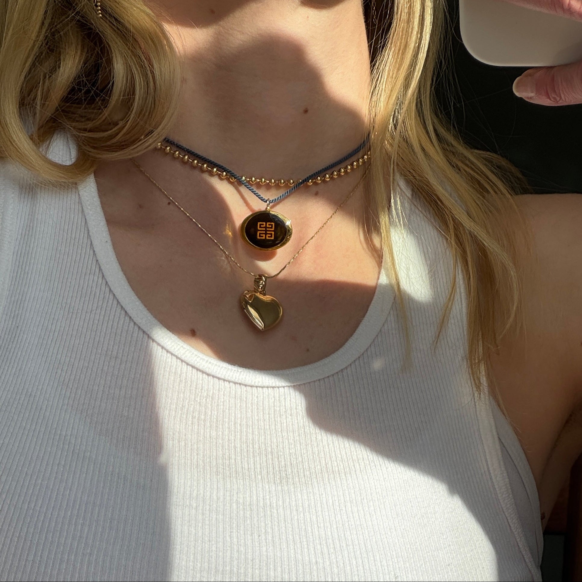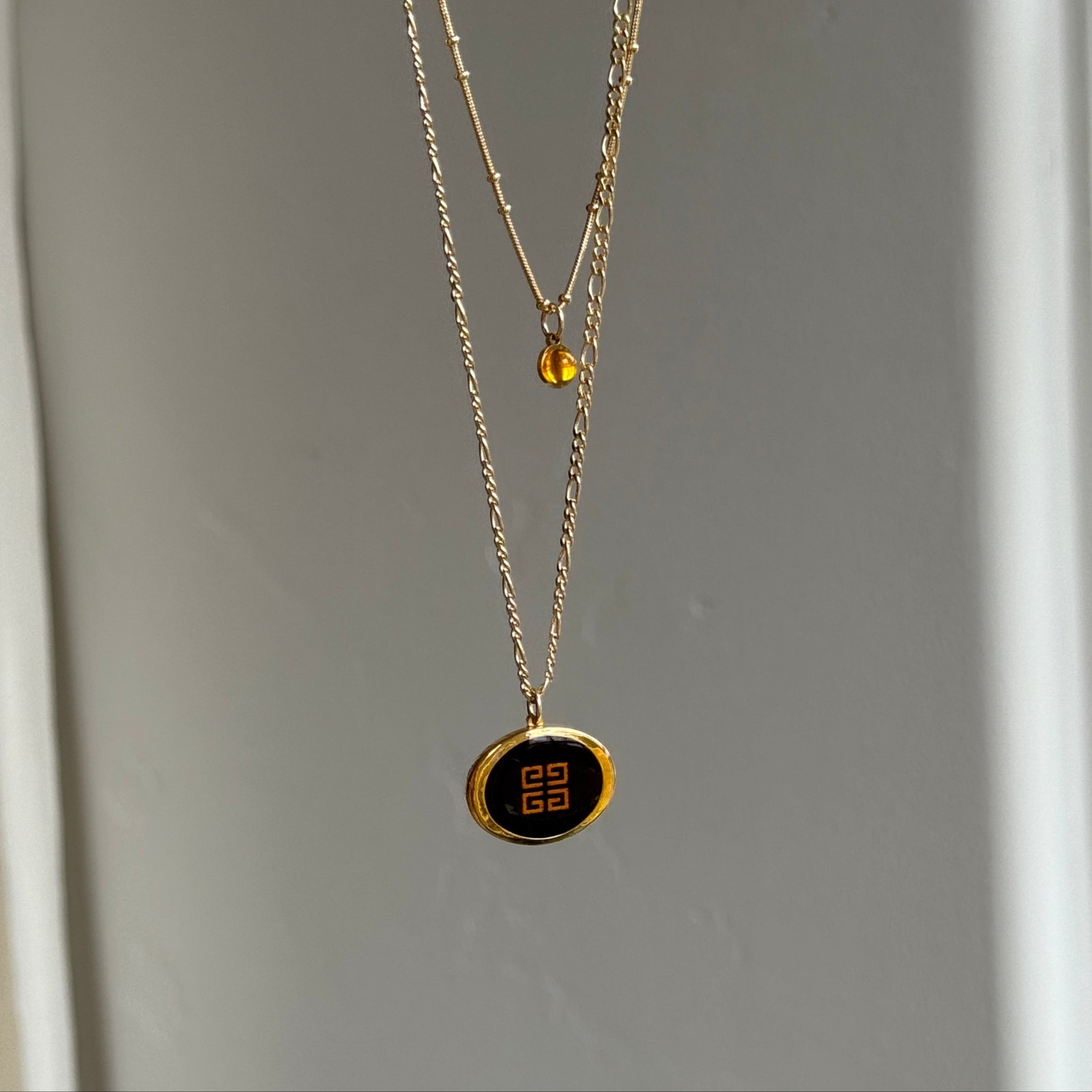 A piece that’s as dynamic as you are—this Vintage Givenchy Pendant Necklace is anything but ordinary. Featuring a rich brown oval pendant and shiny gold trim, its hue subtly shifts when warmed by body heat, creating a mesmerizing, ever-changing effect—almost like a refined take on a mood ring. This one-of-a-kind piece blends vintage charm with an unexpected, almost magical touch.