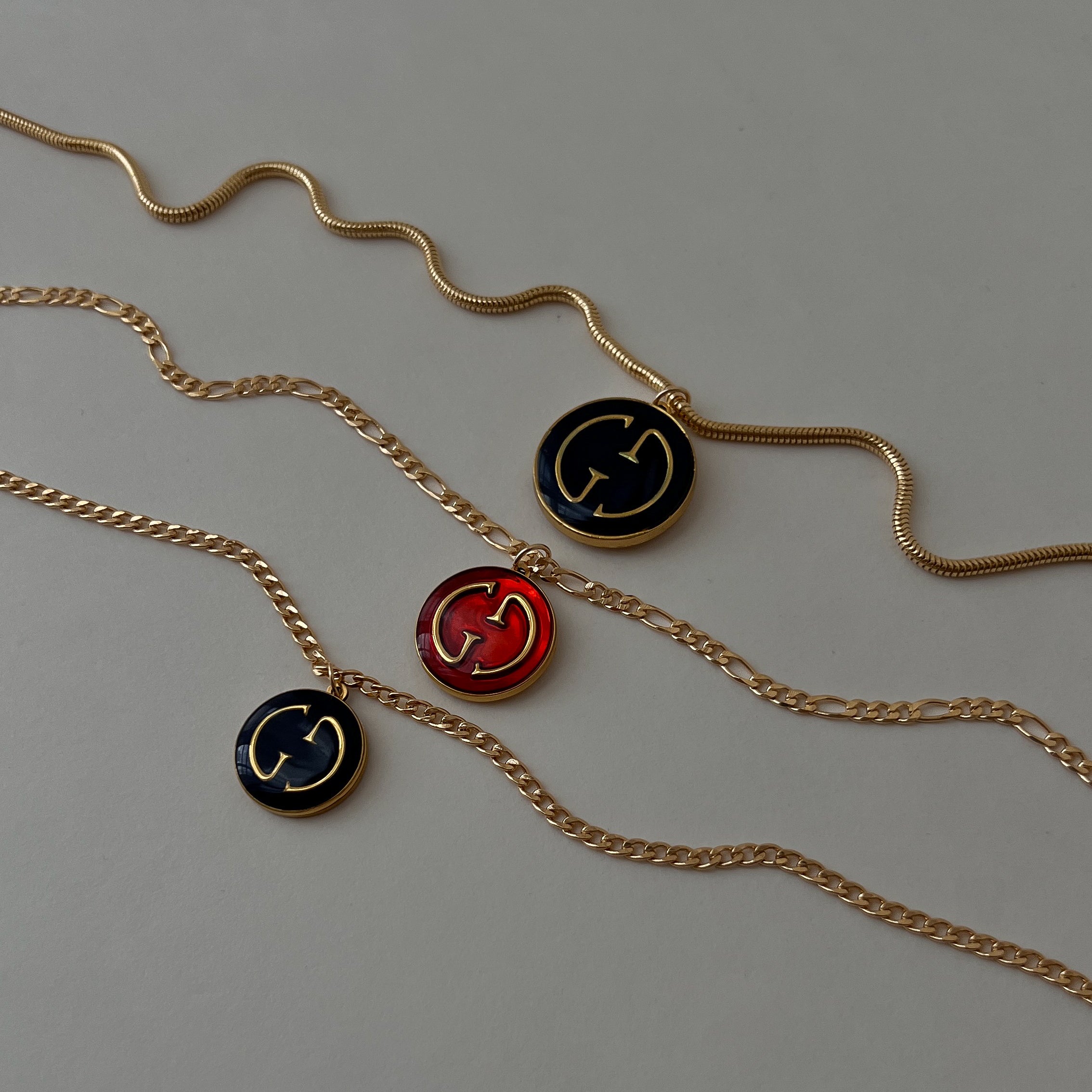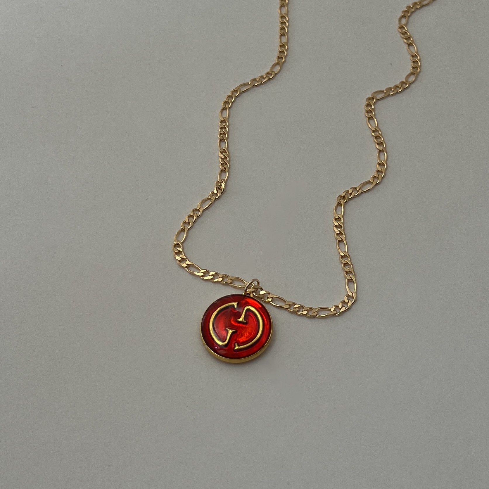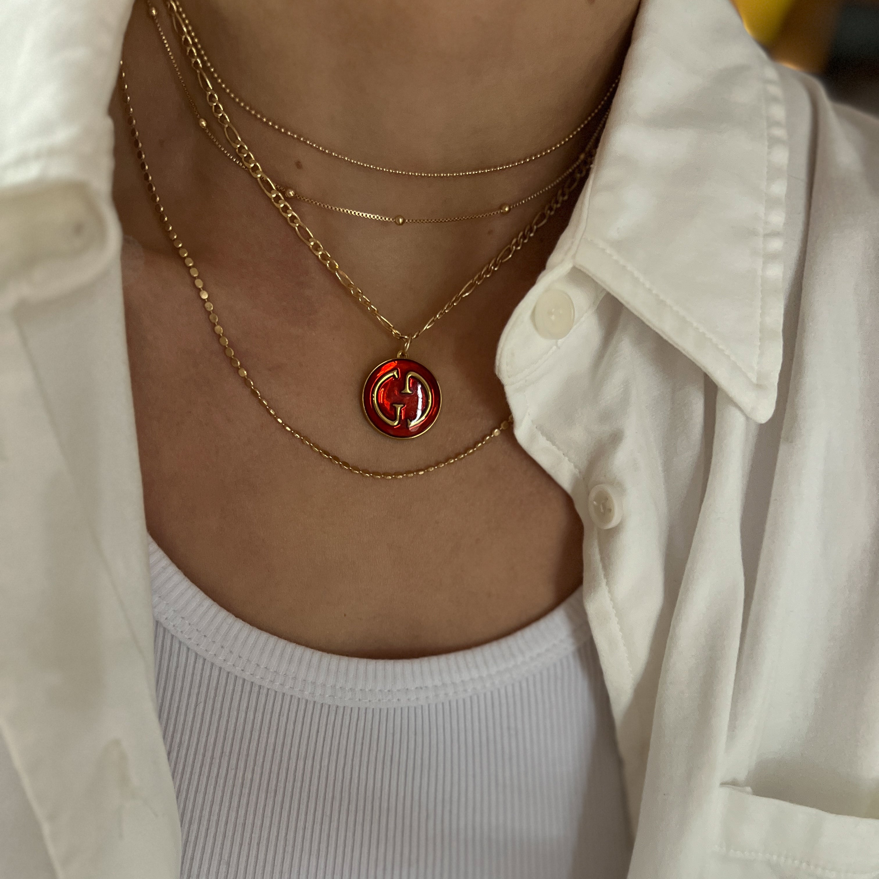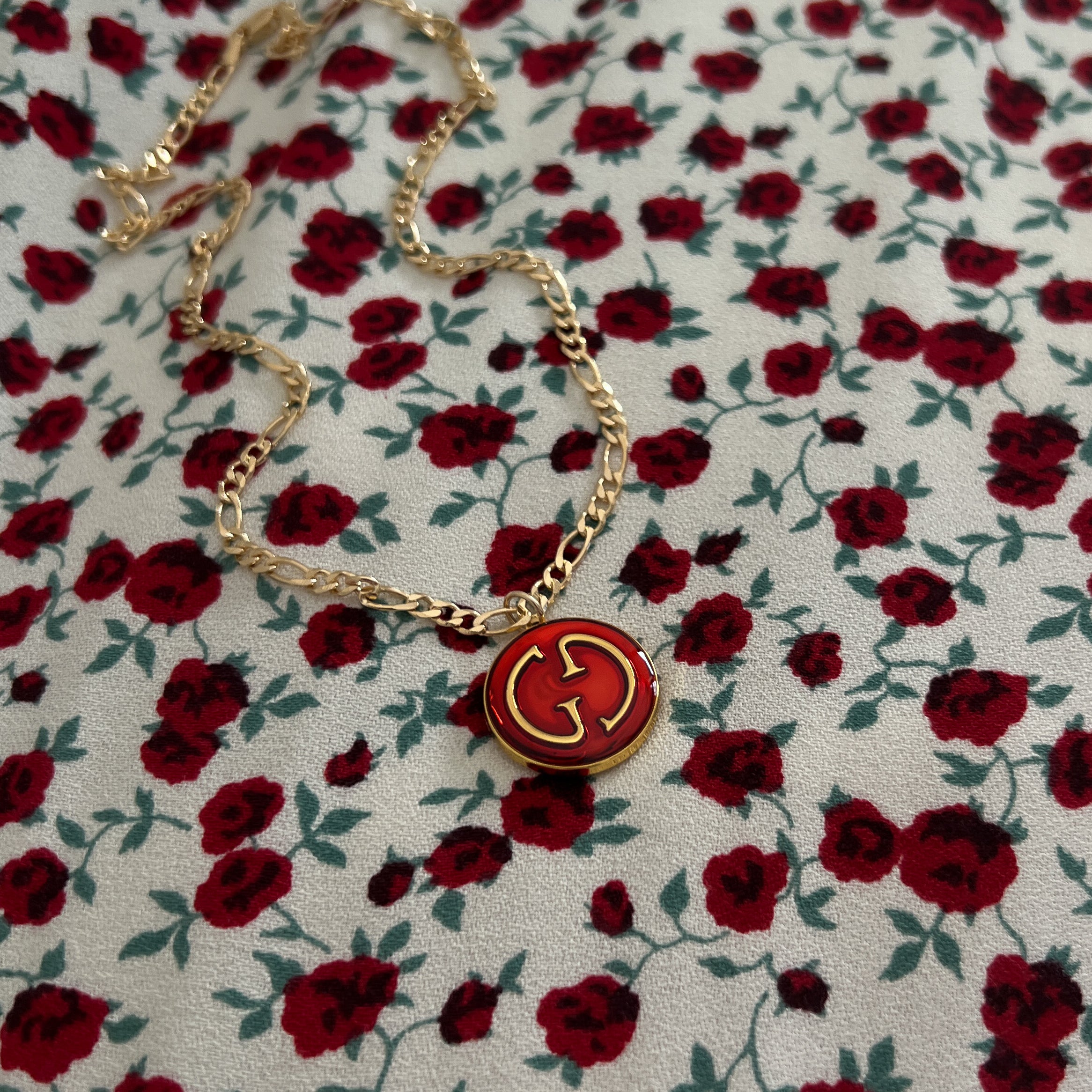 Handcrafted timeless simplicity meets retro 90's vintage gucci. We are obsessed with this classically elegant reimagined epic shimmery red gucci necklace. The contrasting gold interlocking GG logo with the glimmering red adds a hefty dose of sophistication to your neck stack. This necklace is a statement maker. Just wait until she catches the sun light..