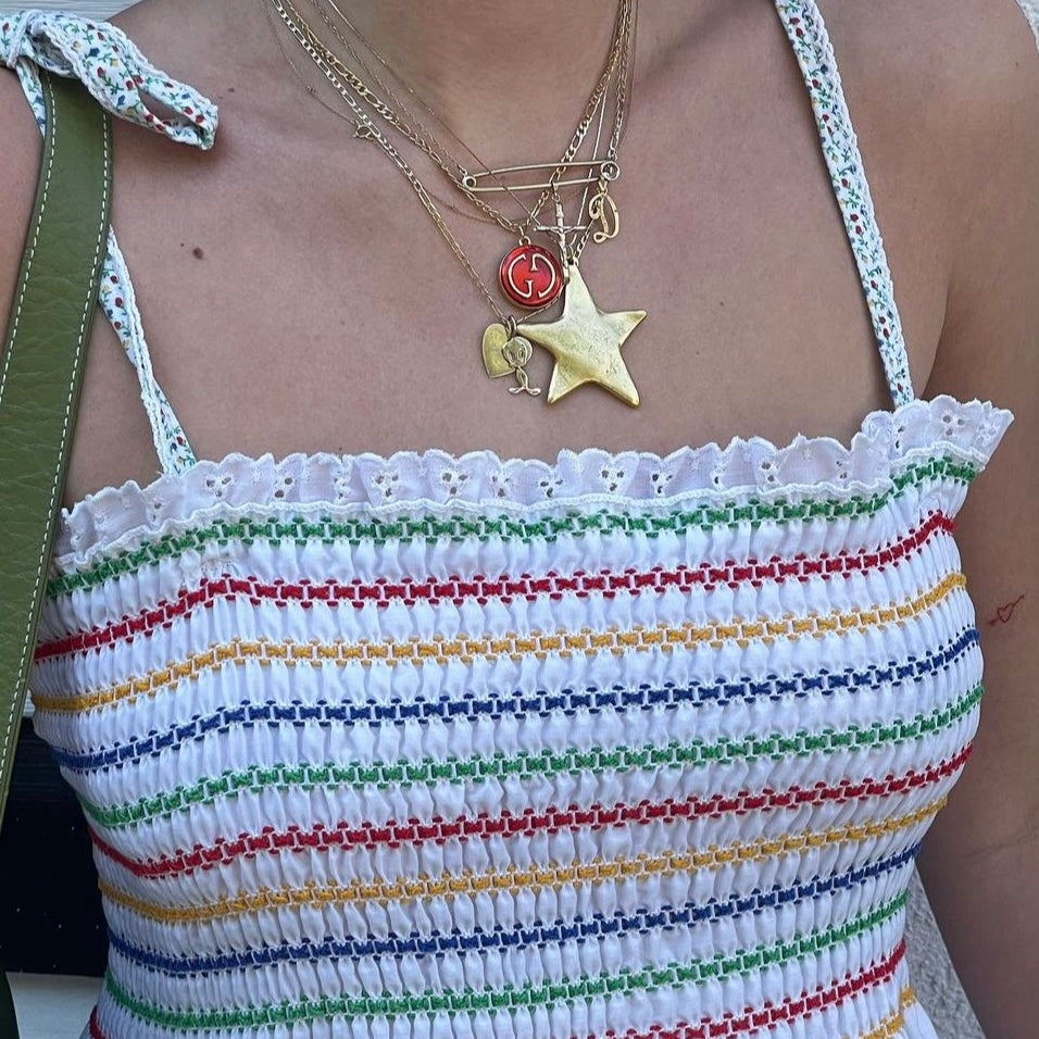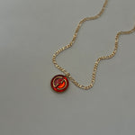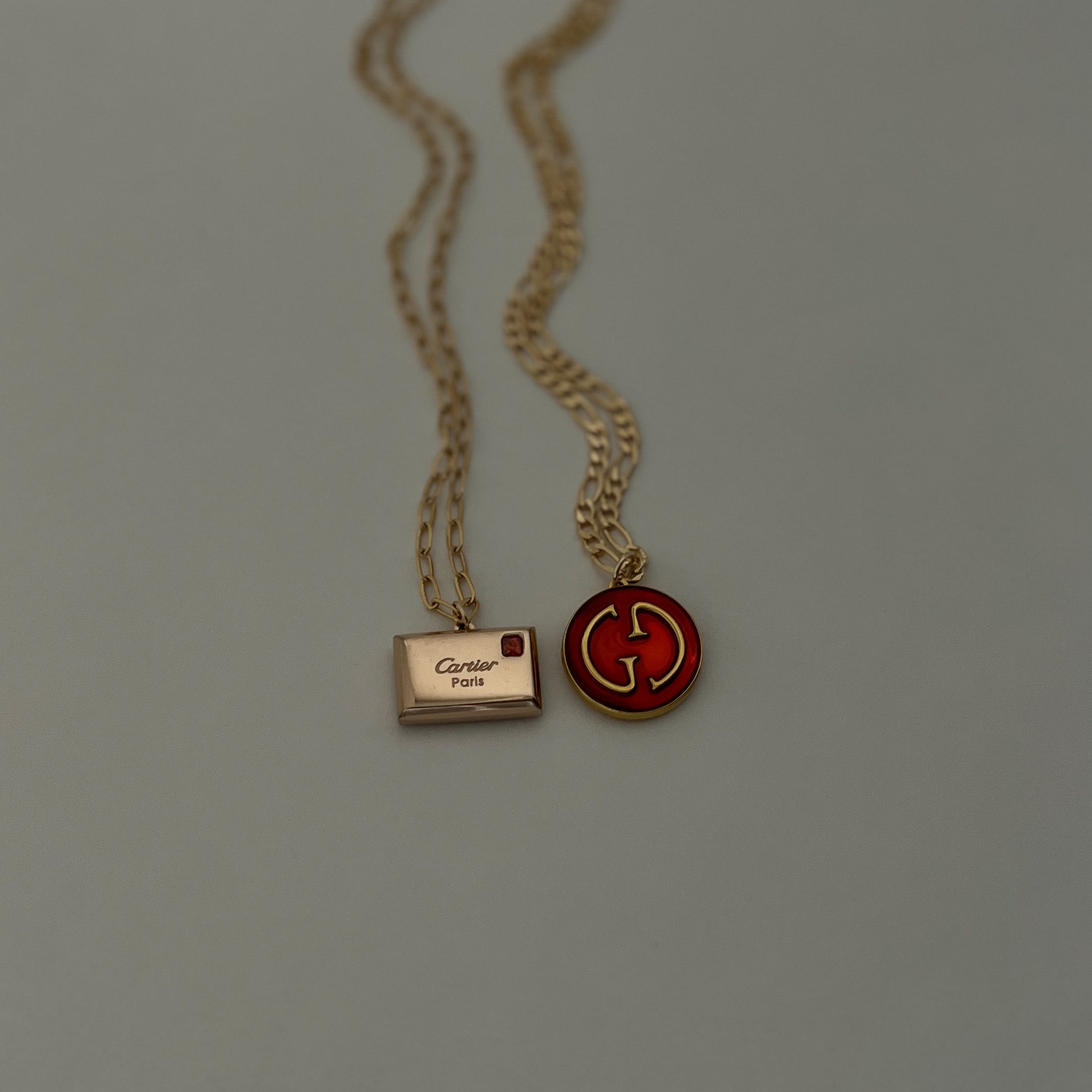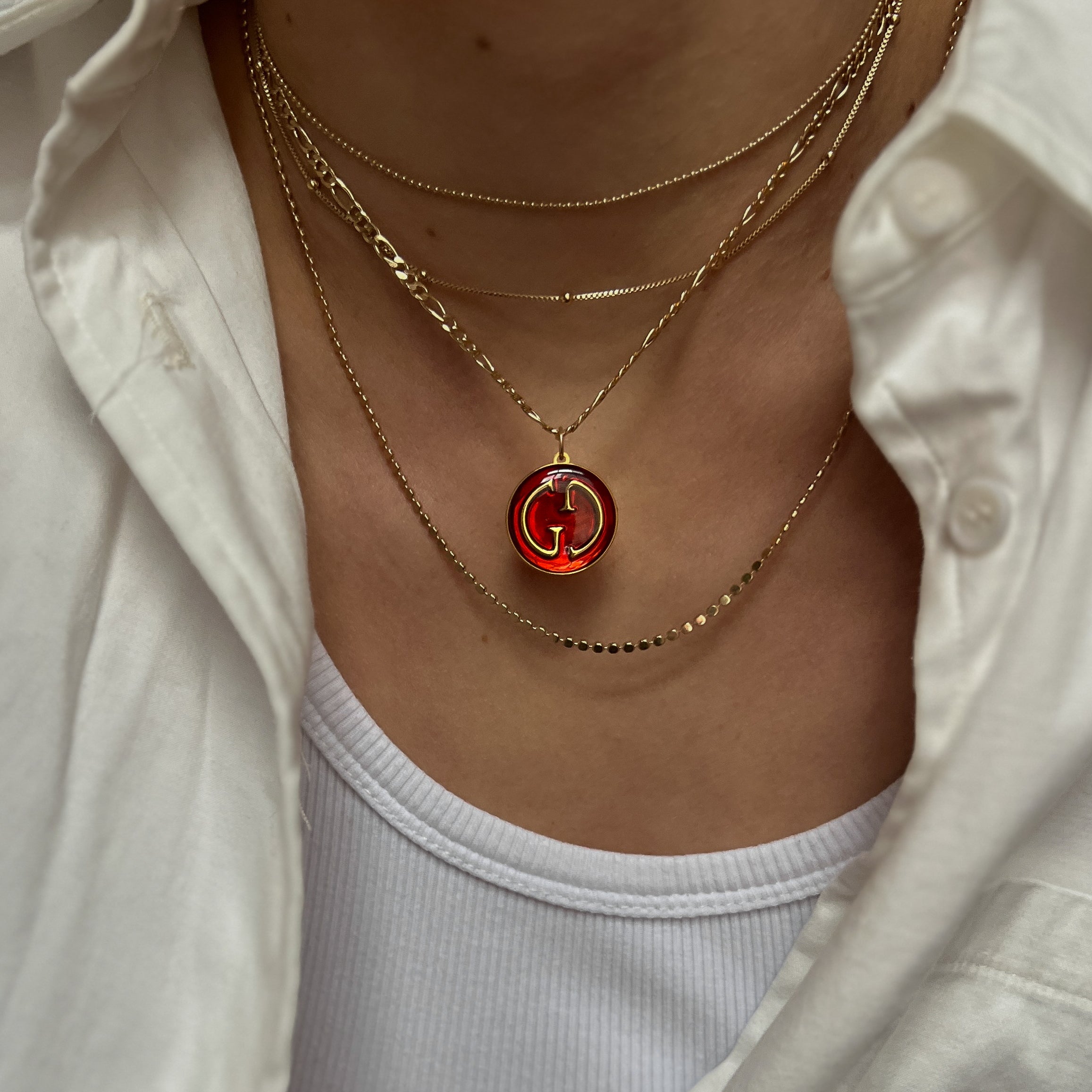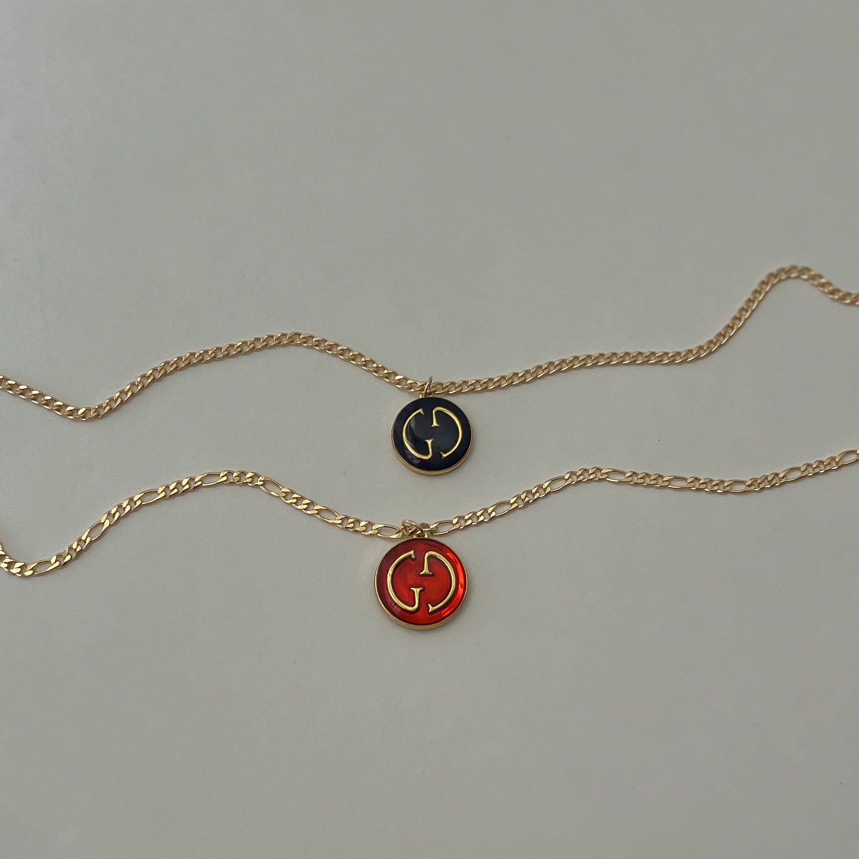 Handcrafted timeless simplicity meets retro 90's vintage gucci. We are obsessed with this classically elegant reimagined epic shimmery red gucci necklace. The contrasting gold interlocking GG logo with the glimmering red adds a hefty dose of sophistication to your neck stack. This necklace is a statement maker. Just wait until she catches the sun light..