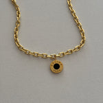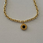 Only One Available. This authentic Celine recreated pendant features a smooth circular form accented with a bold black enamel center and engraved Celine Paris branding โ a refined touch that speaks quietly but confidently. The gold-filled chain adds texture and shine, giving the piece a timeless everyday feel.
