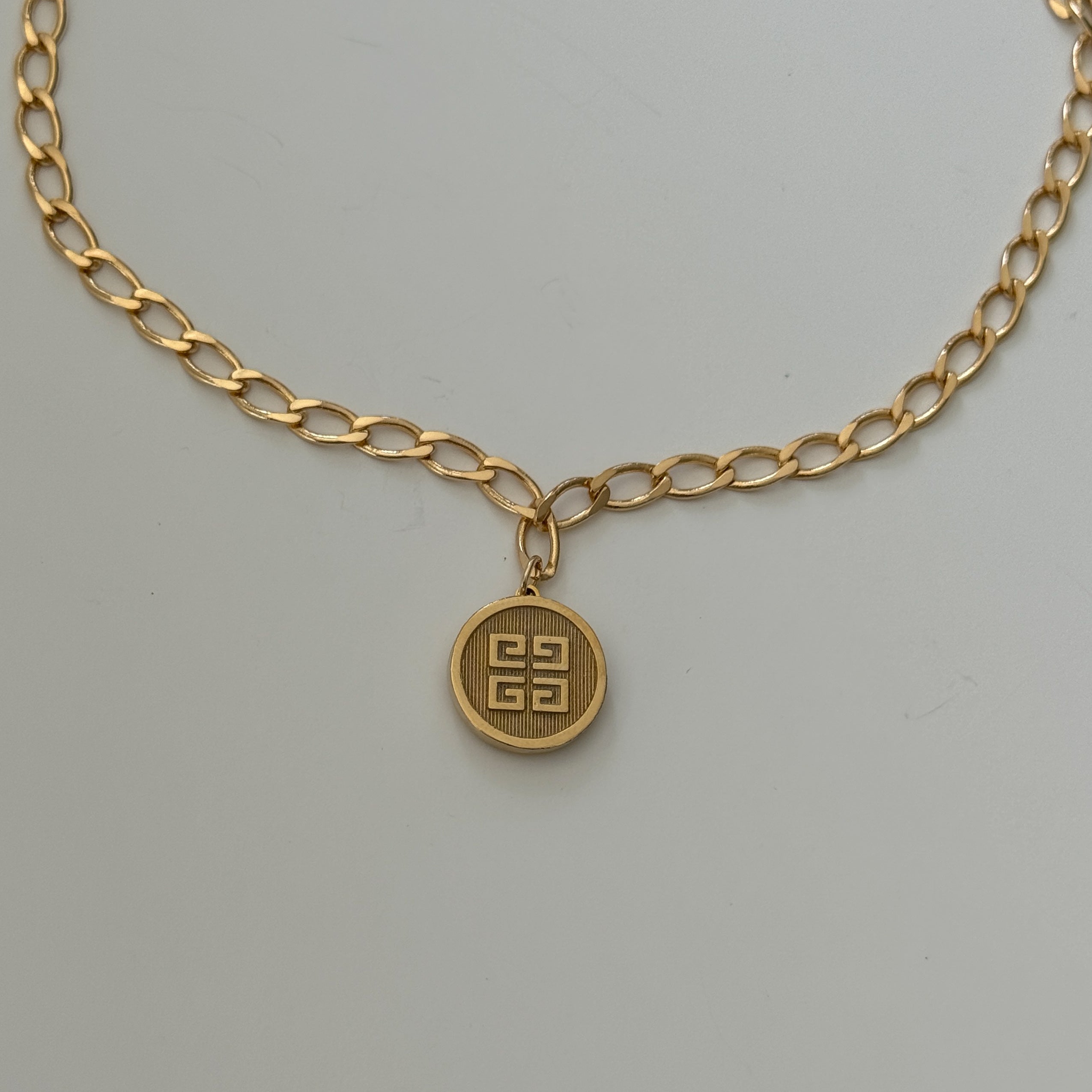 This Givenchy gem is particularly special and unique. Featuring a lined textured center with a raised Givenchy logo, the detailing on this gold pendant makes for a cool vintage feel.