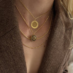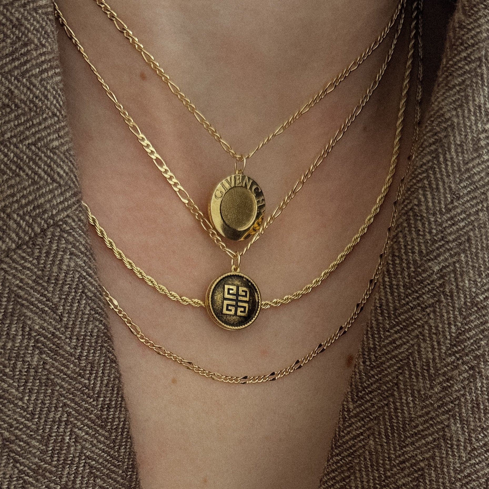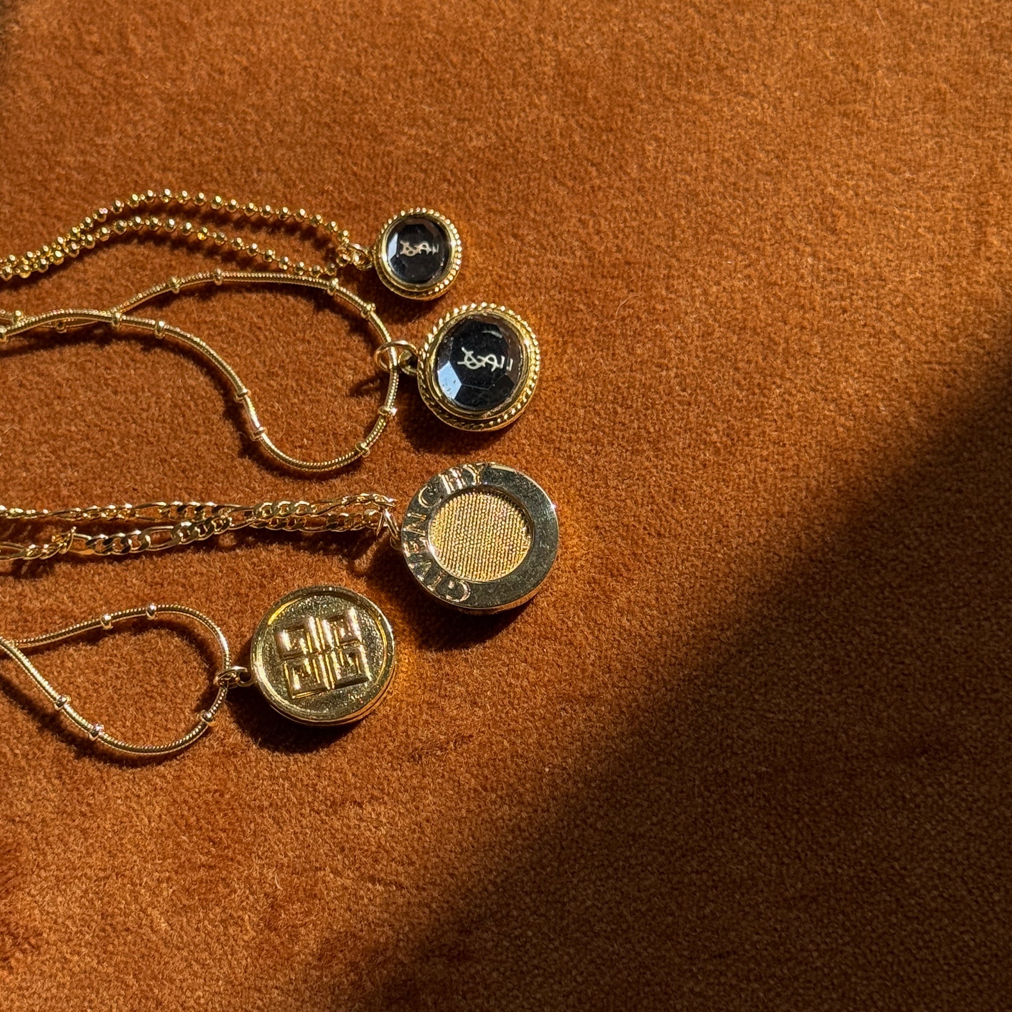 This authentic Givenchy pendant features the house name wrapped around a textured gold center, creating a bold yet refined graphic moment. Its rounded, sculptural form catches the light beautifully, offering just enough shine for everyday wear. Finished on a gold-filled ball chain for a touch of retro edge.