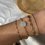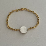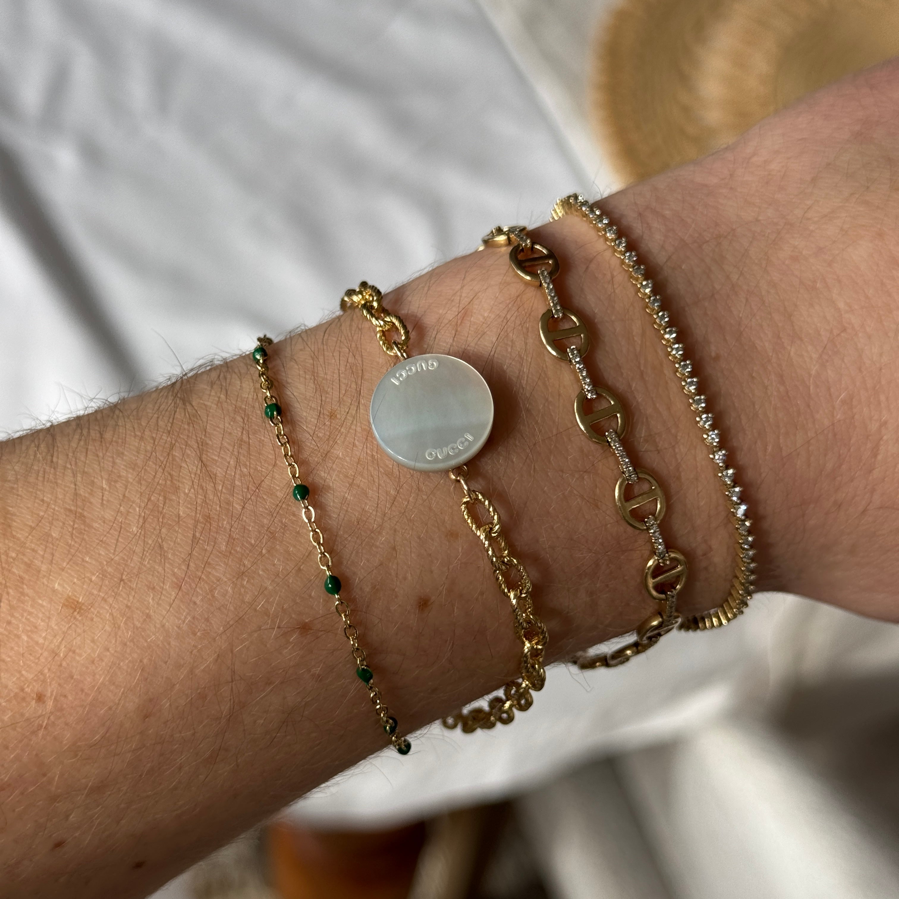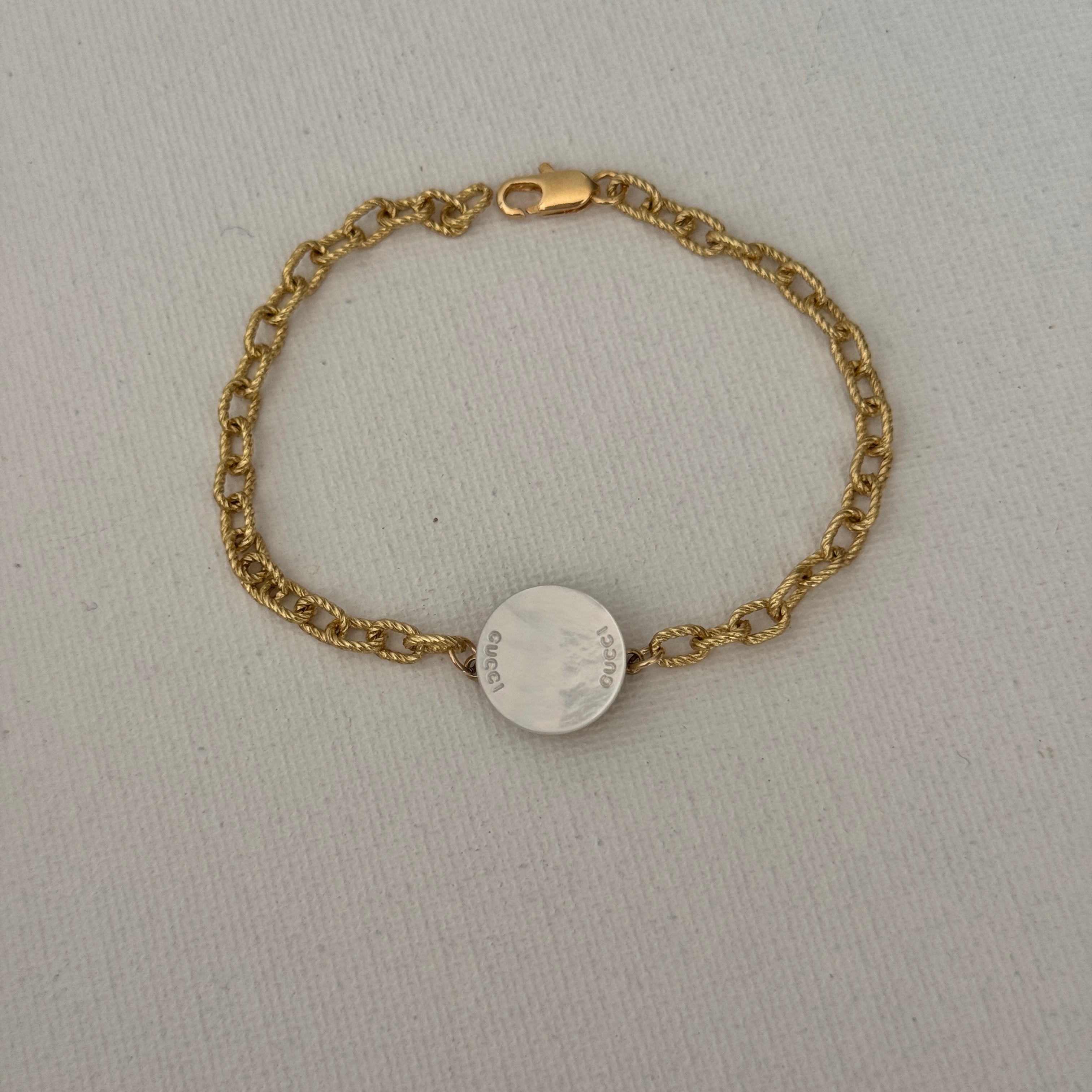 This authentic vintage Gucci charm features a luminous pearlescent disc etched with the Gucci name on both sides — delivering a subtle designer moment with every move. Paired with a textured gold-filled rope chain, it adds instant polish to your wrist stack while still feeling understated and effortless.