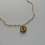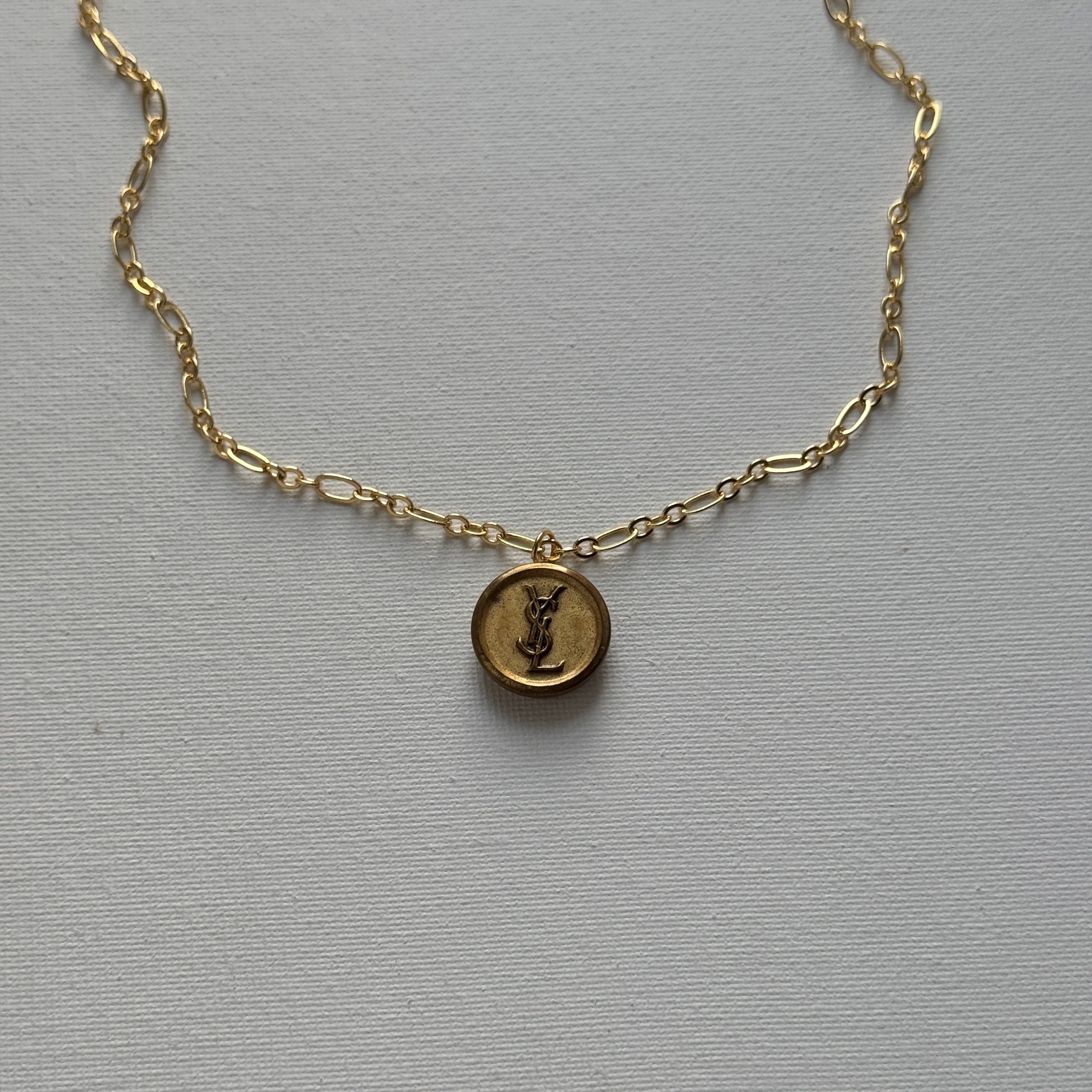 This necklace features an authentic vintage Yves Saint Laurent pendant with a classic round silhouette and raised logo detailing, styled on a simple gold chain for everyday wear. The softly aged finish adds character while keeping the look timeless and understated. A true vintage piece designed to layer effortlessly or wear on its own