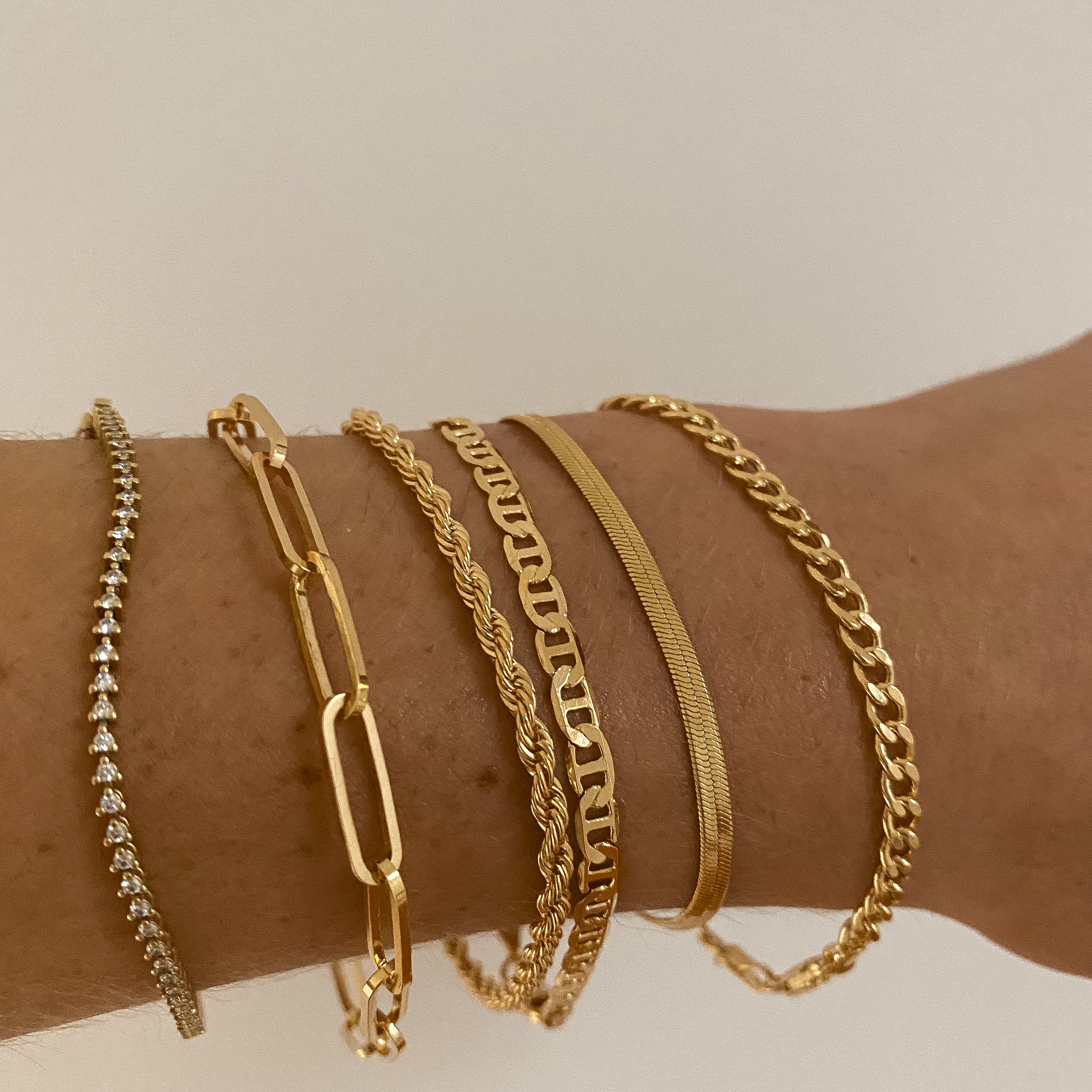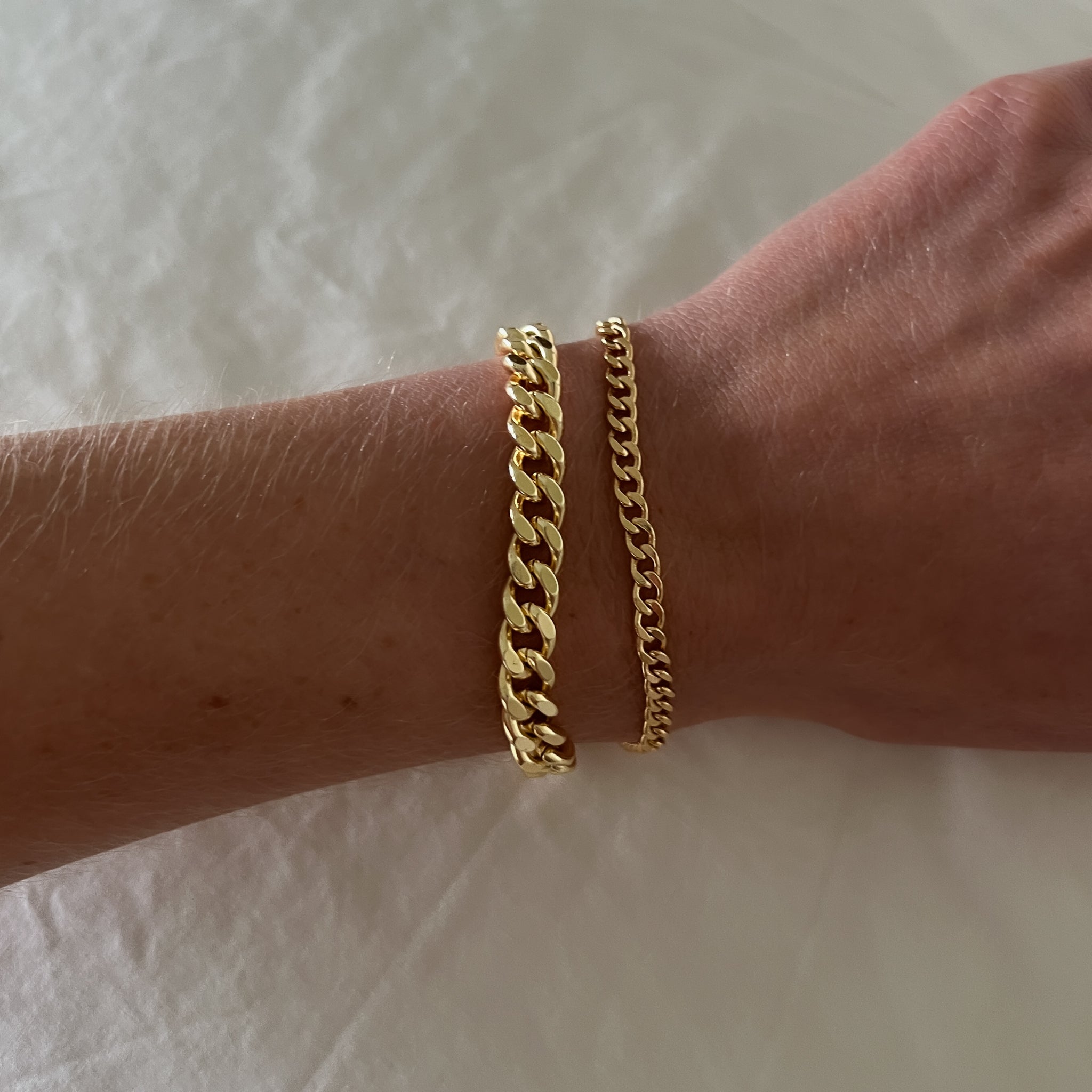 The larger of the curb chains - she is here to make a statement for all your looks. 18K gold filled to total perfection, for real. Finally, a long lasting gold bracelet you never have to take off.