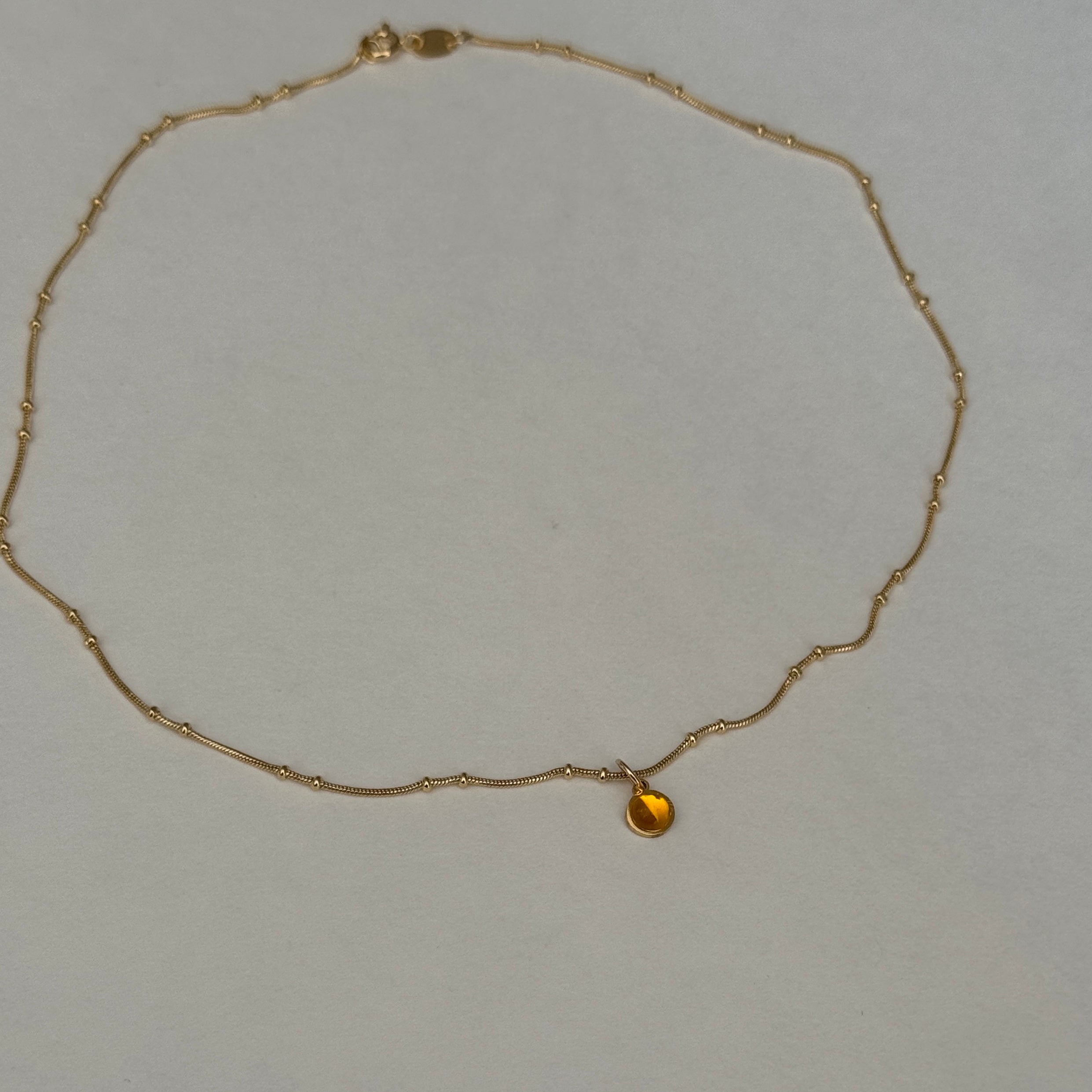 Add a touch of sunshine to your layers with this mini citrine charm necklace. Featuring a small, handmade citrine disc charm elegantly suspended on our best-selling dainty gold-filled satellite chain, it’s the perfect subtle pop of color to liven up a neck stack.
