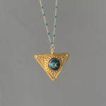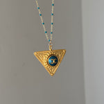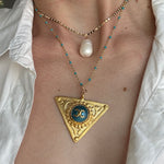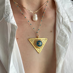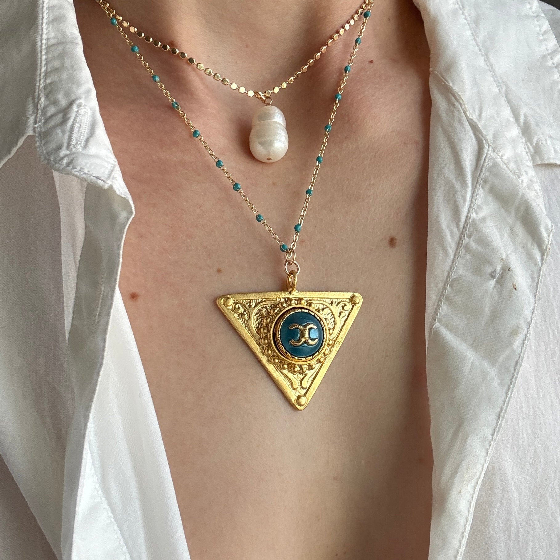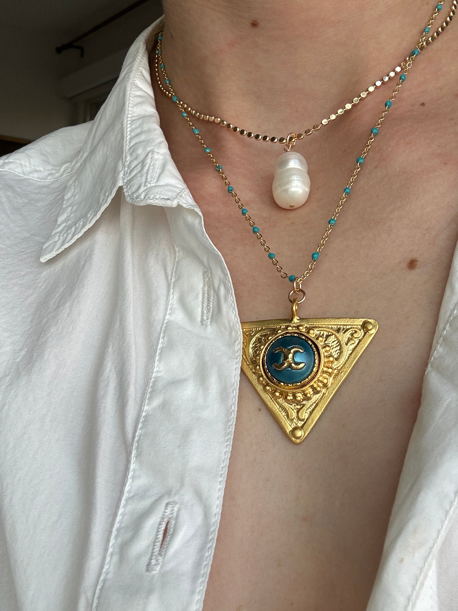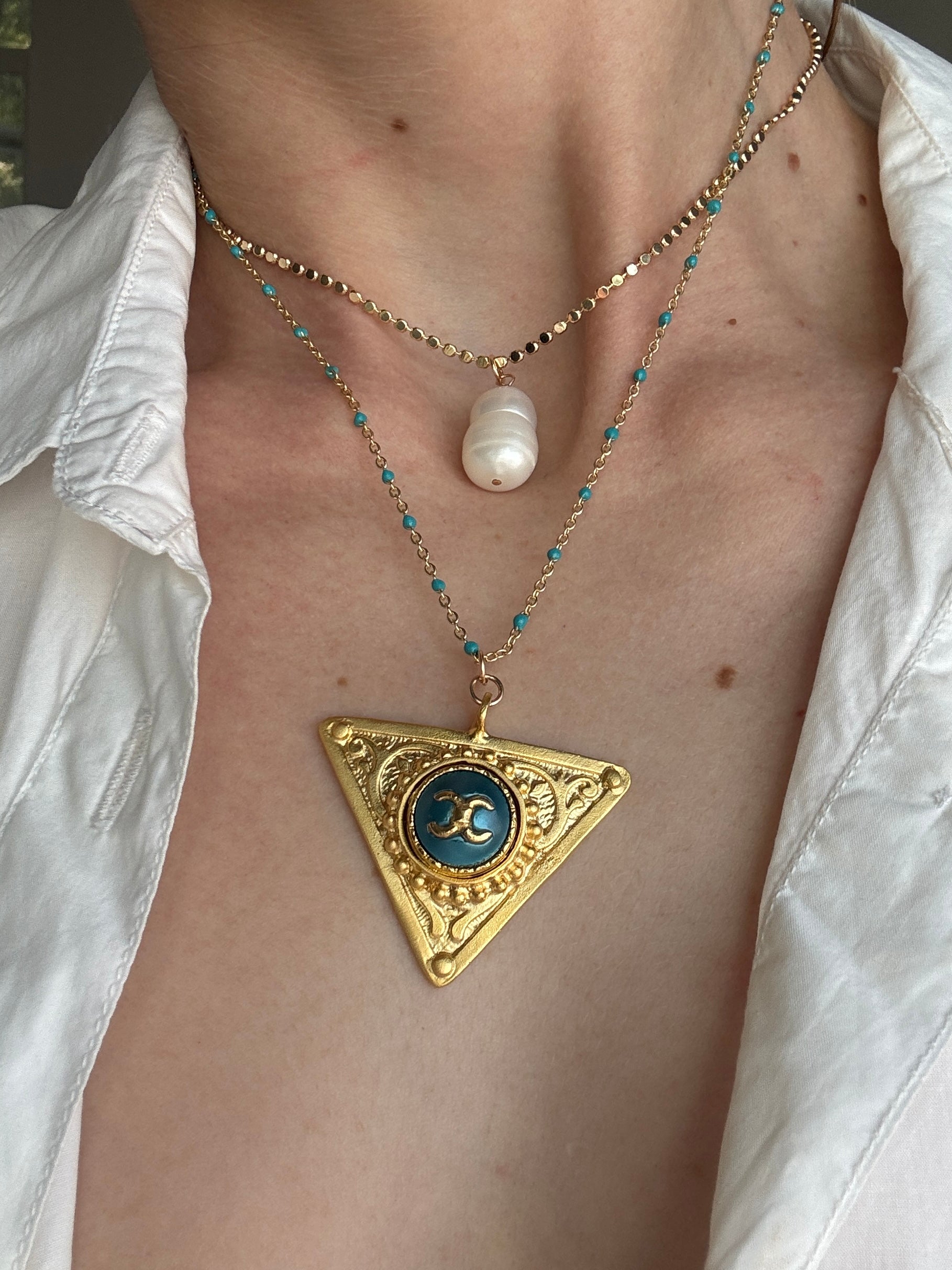 Bold. Regal. Unapologetically chic. A conversation piece built for the spotlight. This striking pendant centers an authentic Chanel button — a rich sapphire enamel emblazoned with the iconic interlocking C’s — set into a handcrafted gold-tone Art Deco-inspired frame. The sculptural triangle silhouette, ornate detailing, and dimensional finish create a true statement piece with couture energy. Suspended from a gold-filled chain adorned with electric-blue enamel accents, it’s a perfect blend of edge and elegance.