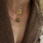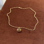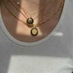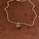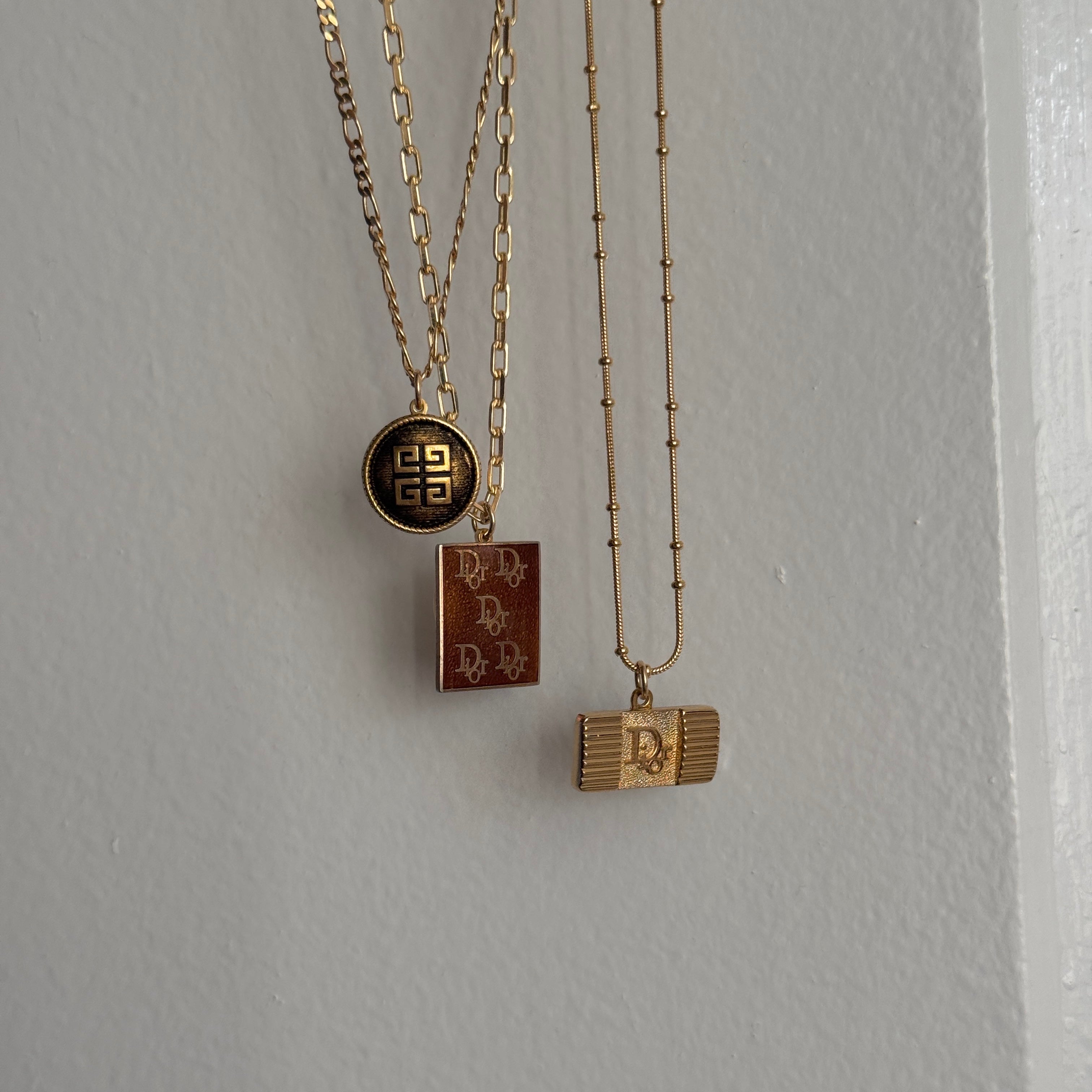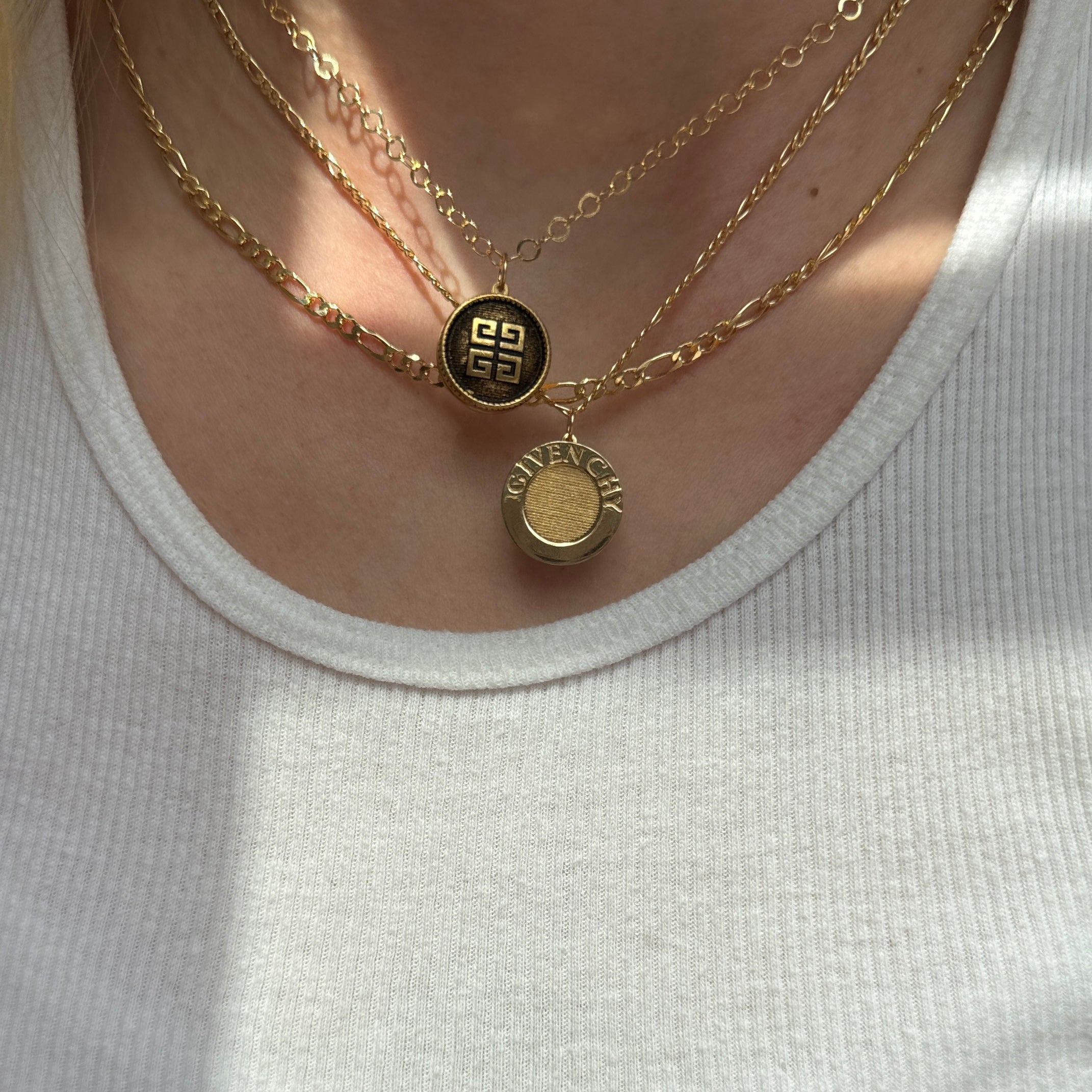 This authentic vintage medallion features the signature Givenchy emblem set beneath a subtly domed surface with a rich bronze-gold finish. The depth and patina give it a lived-in luxury feel โ€” elevated, but not too polished. Paired with a gold-filled chain for just the right amount of modern shine.