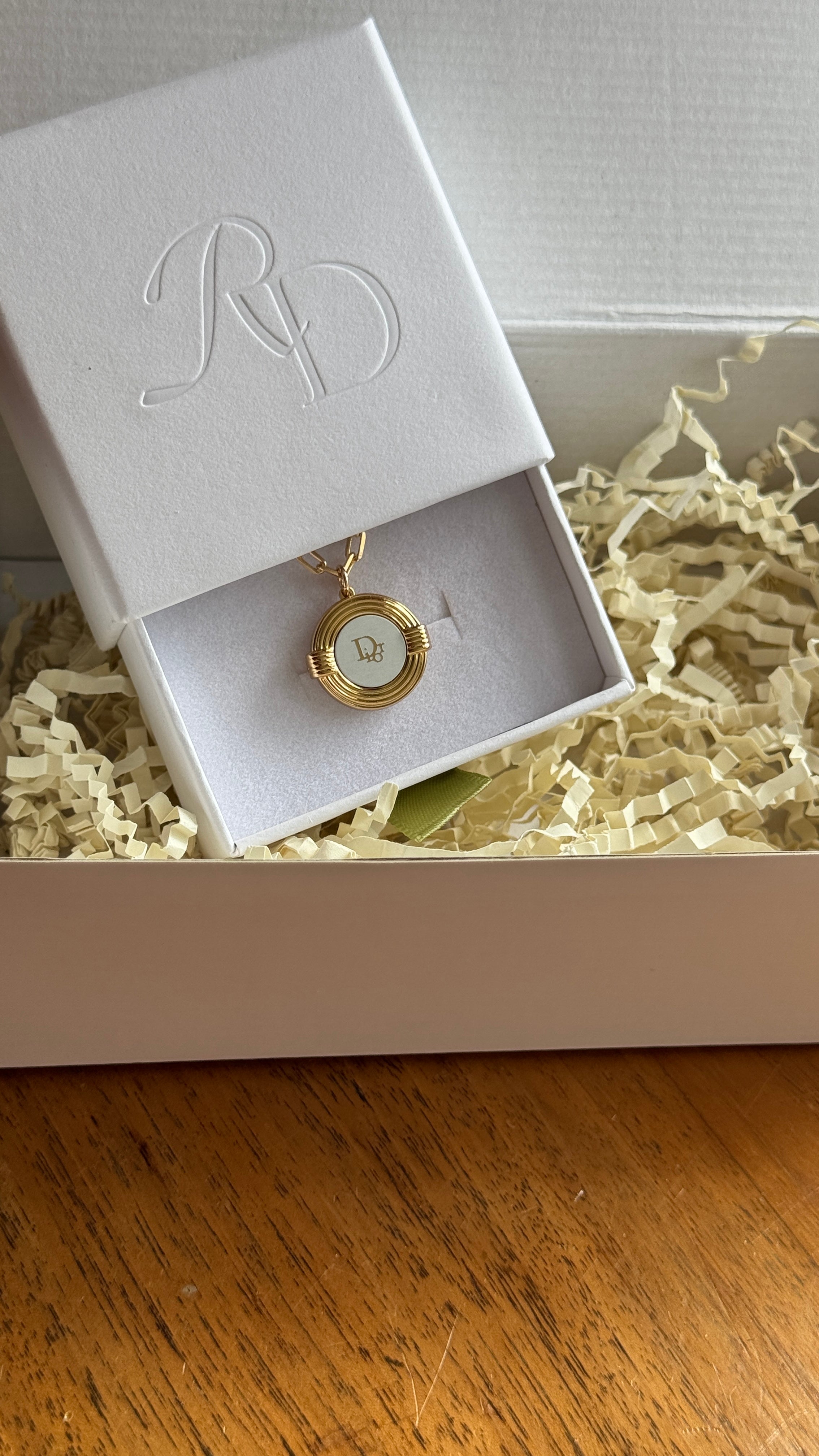 Chic and timeless, this 90s Vintage Dior Pendant Necklace features a round design with elegant Dior script text at the center, framed by sleek gold grooved trim for a sophisticated silhouette. A subtle nod to '90s glamour, it’s the perfect piece to layer or wear solo for an effortlessly polished look.