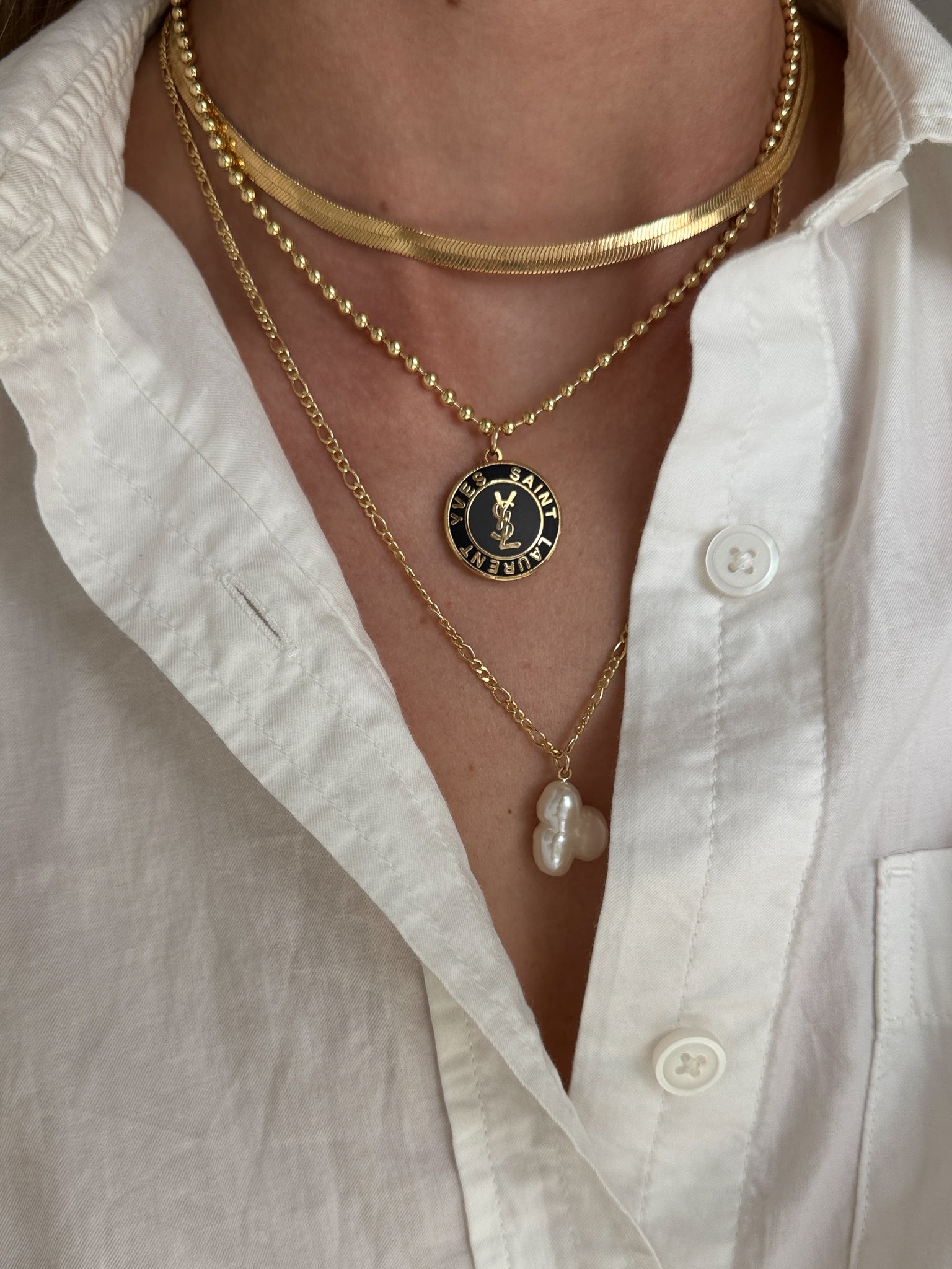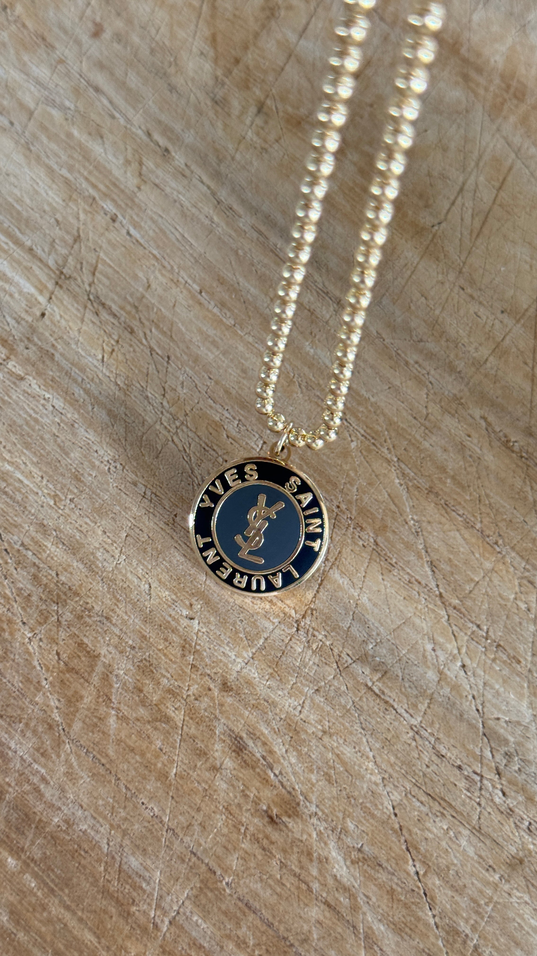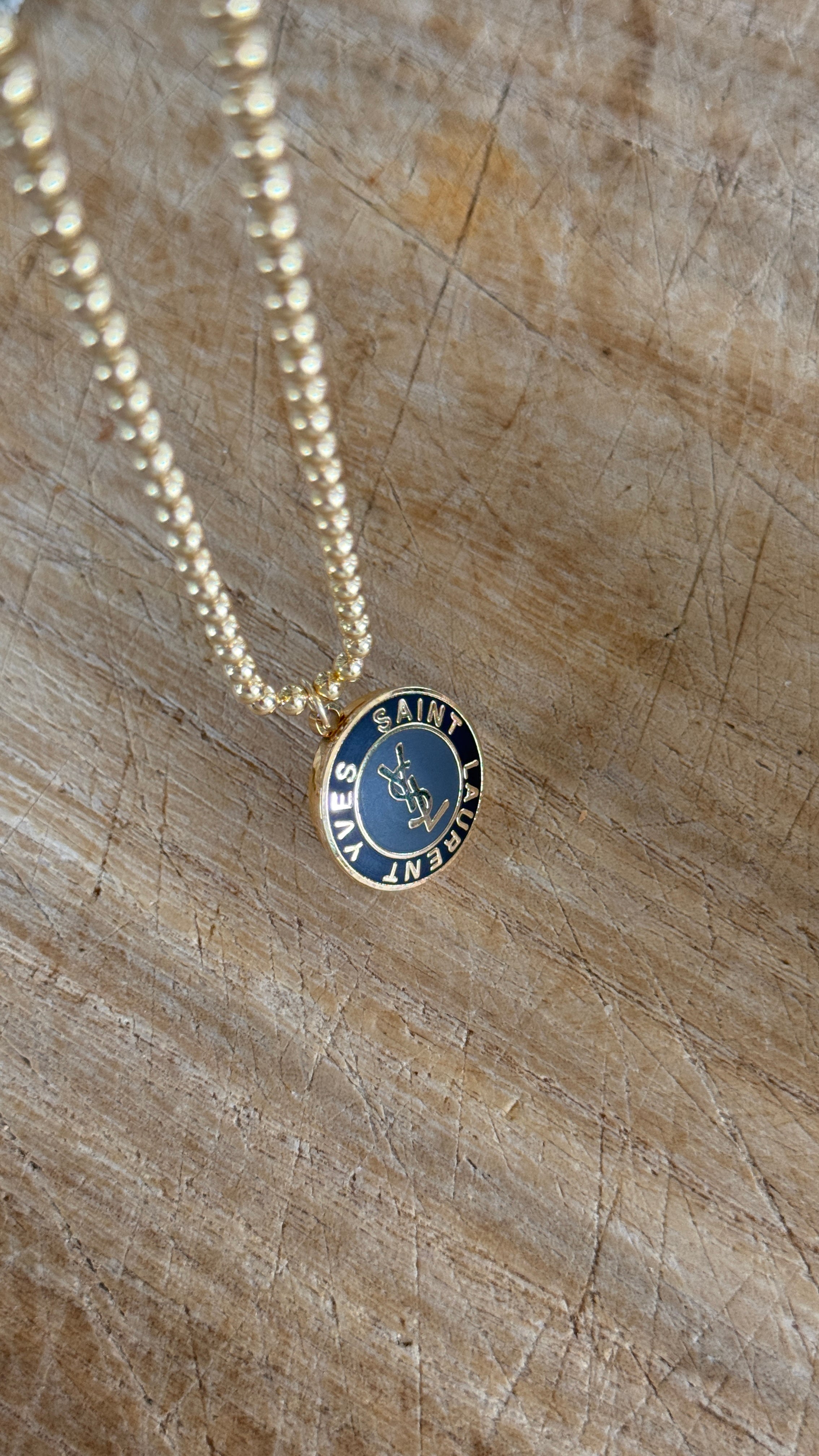 Striking, sophisticated, and effortlessly chic—this Vintage YSL Pendant Necklace captures the essence of Yves Saint Laurent’s iconic design aesthetic. Featuring a cool two-tone palette of deep navy and black, the pendant is adorned with elegant gold script and the classic YSL logo. The interplay of light and dark tones creates a visually captivating effect that feels both vintage and contemporary—making it the ultimate statement for summer and beyond.